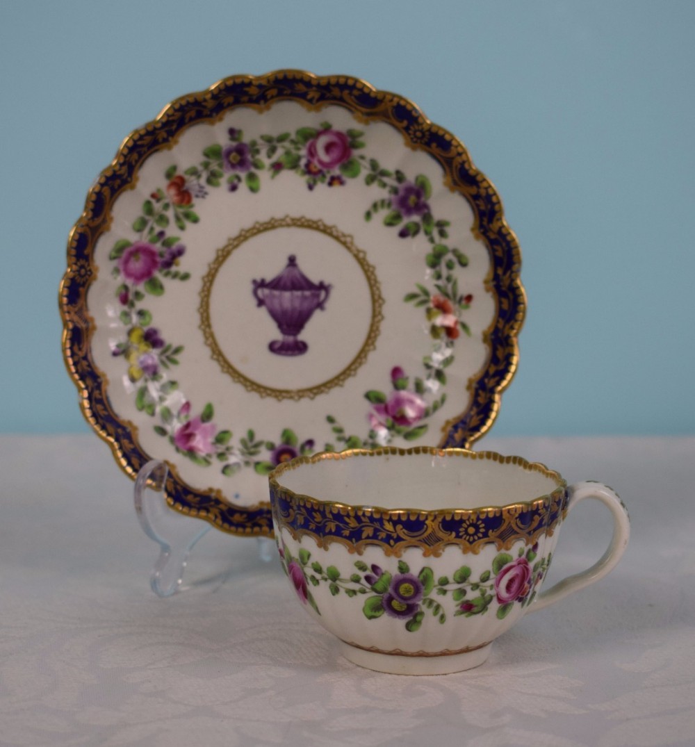 Stunning Worcester 1st Period Fluted Cup & Saucer Polychrome Enamels Floral Frieze Urn Cobalt Blue c.1770