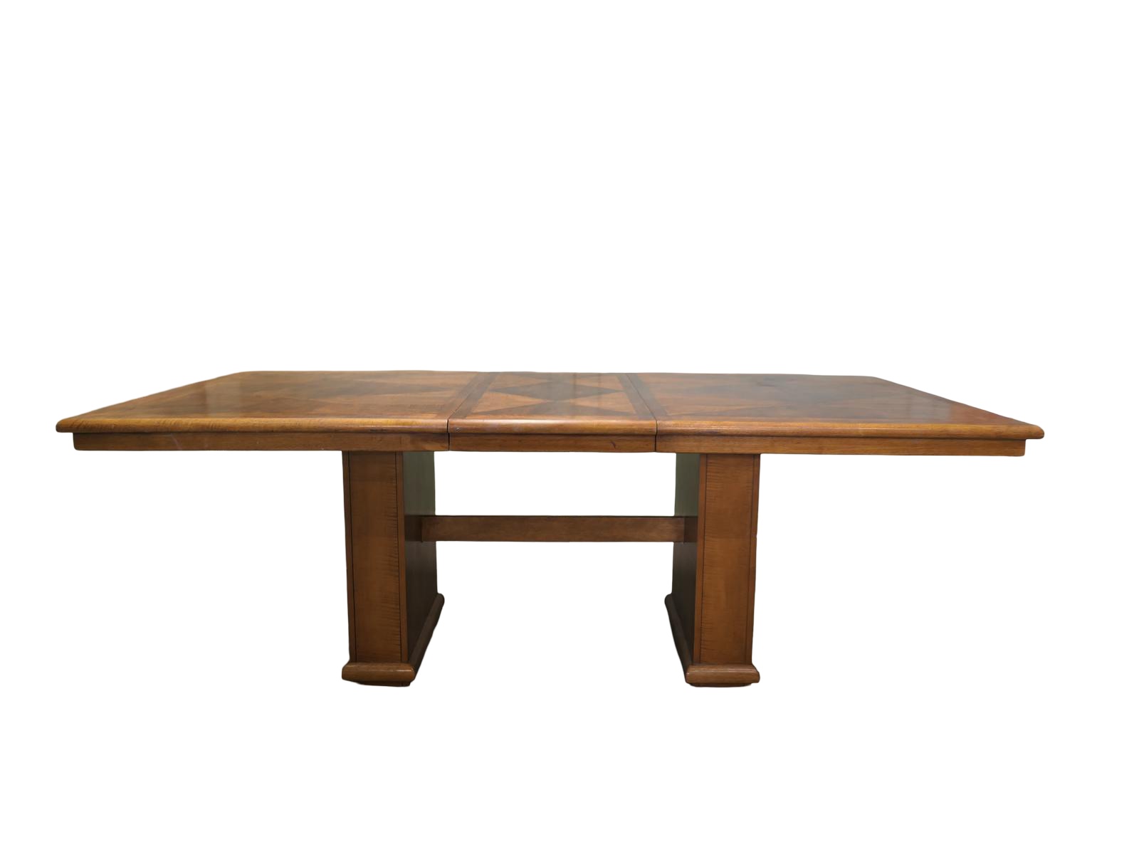 The ultimate in Mid Century Chic, this is a real beauty, the table extends with a centre leaf, it has a double pedestal base, with a cog and gear mechanism, the table top and the leaf are Veneered in a giant diamond pattern and it is in generally good vintage condition