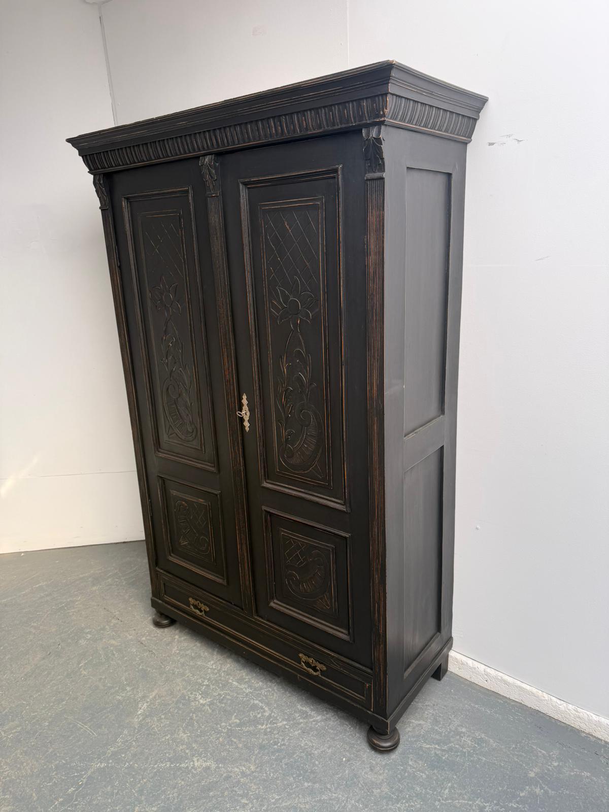 Stylish Original Hungarian Antique Pine & Oak Painted Black Hall Wardrobe