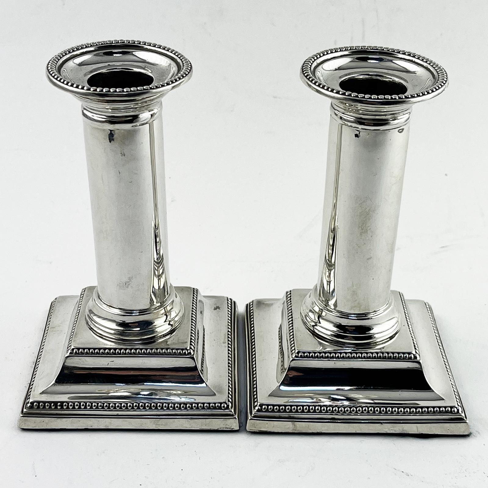 Stylish pair of sterling silver Edwardian (1908) candlesticks with detachable beaded nozzles, plain columns and sloping square beaded bases. Both candlesticks are in very good original condition without any holes to the highlights. Weight is for the pair and includes loaded bases. Maker: Thomas A. Scott, Sheffield