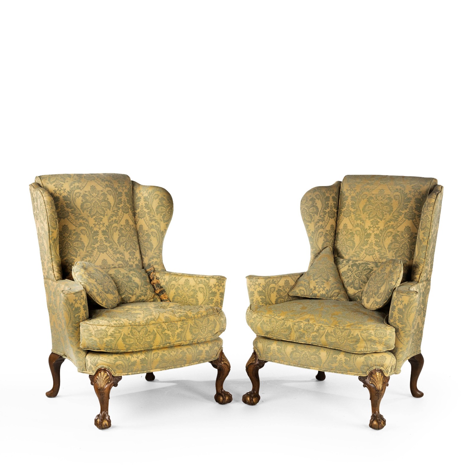 Substantial Pair of Early 20th Century Walnut & Gilt Framed Wing Chairs
