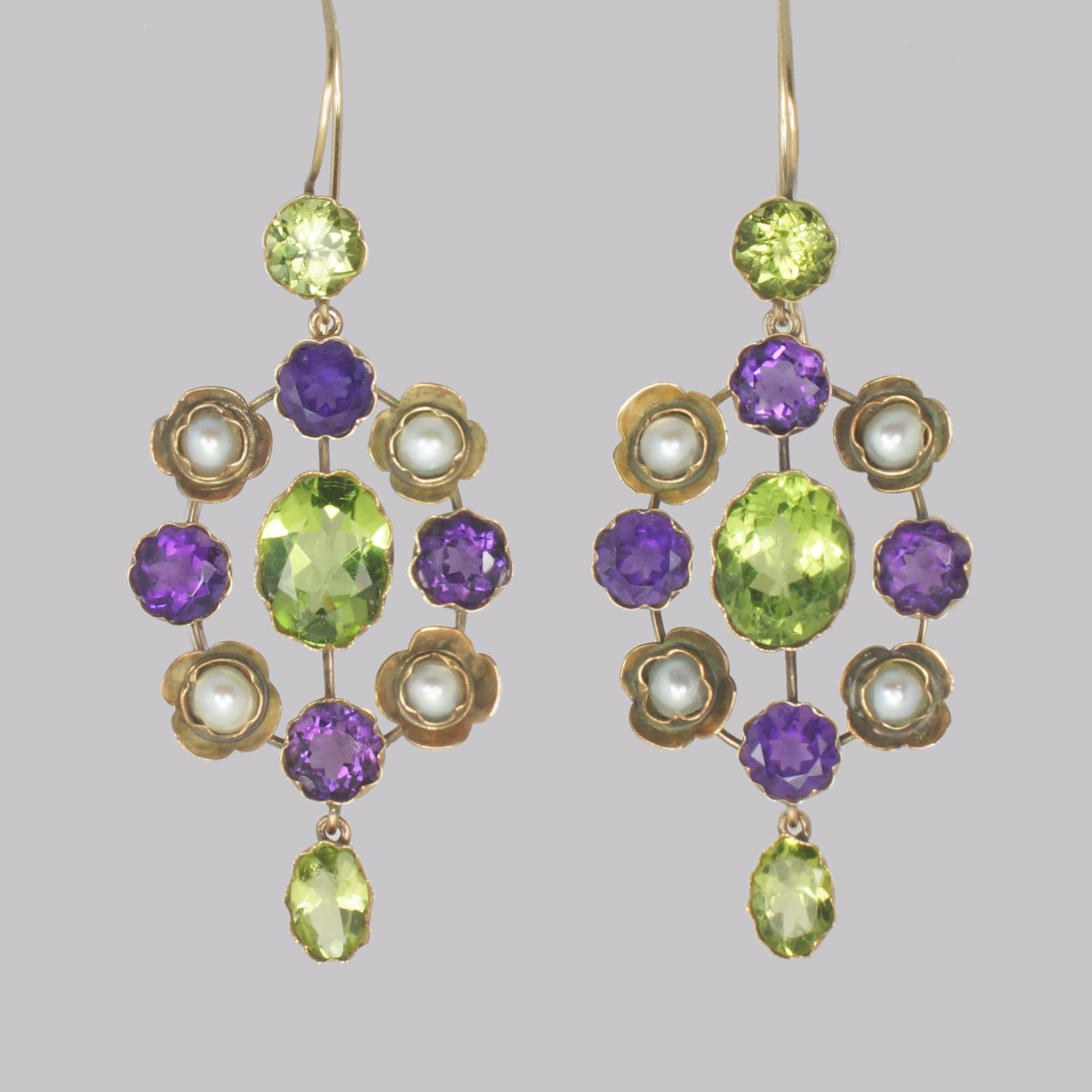 Suffragette Earrings Amethyst Peridot Pearl 15ct Gold Edwardian Dangle Earrings