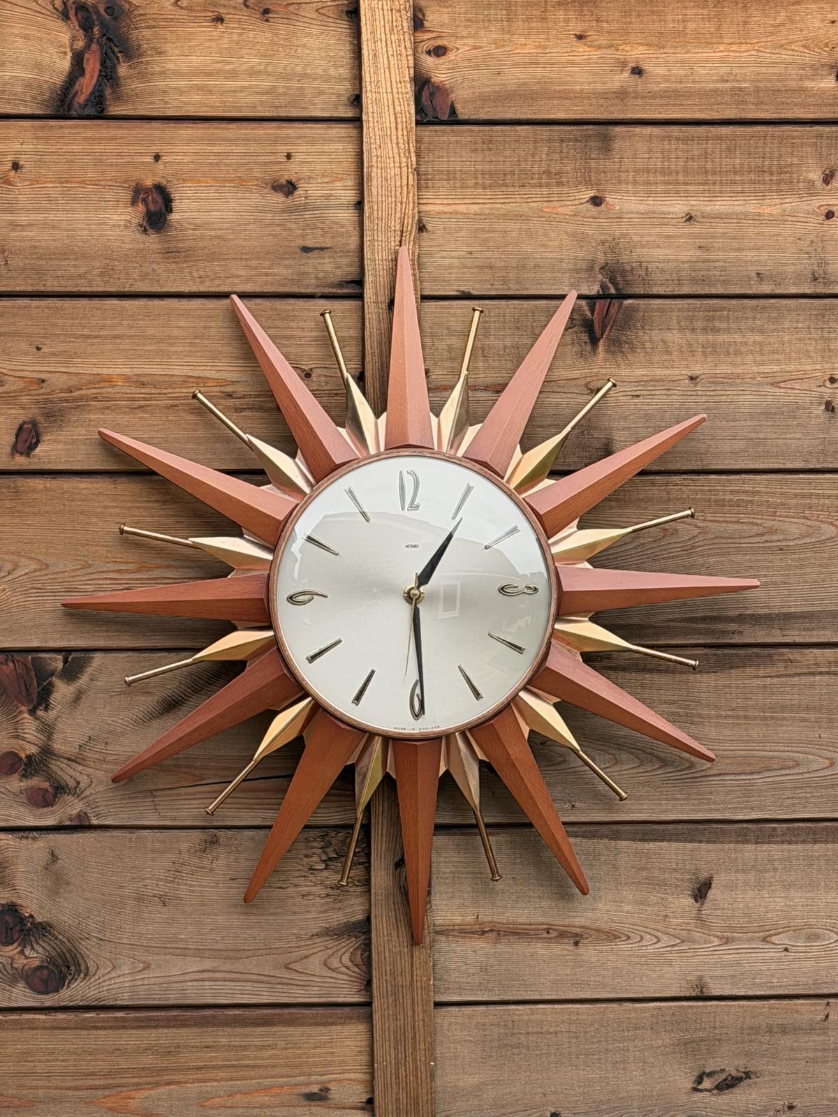 This clock is the larger and a more desirable three dimensional atomic Sunburst design, with all the adornments of the 1960s.