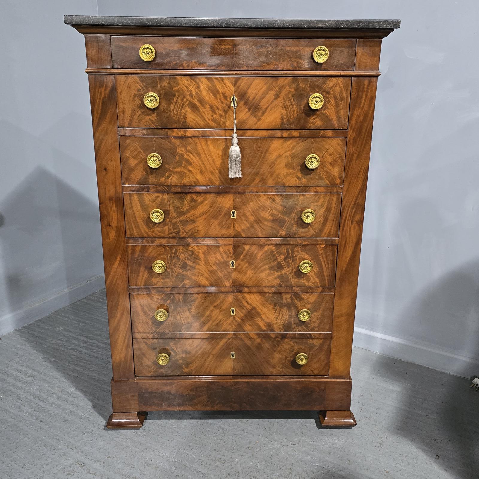 A super quality French six drawer mahogany chest of drawers with stunning gilt handles and original working key, oak lined throughout and with a black marble top, bottom two drawer are actually a single drawer, lovely colour and condition.