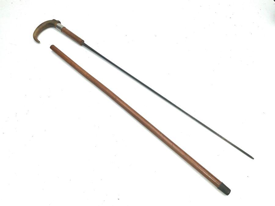 Horn crooked handle typical of that era the year being 1902 Birmingham. The wood's Malacca, the blade's high tensioned steel, and all's in very good condition. Total length of 92 cm, across handles 12 cm, stick's diameter from handle 25 mm tapering down to ferule 18 mm, from steel's tip to top of the handle being 85 cm.