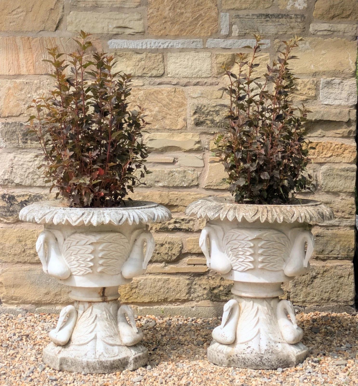 Super Pair of Early 20th Century Carved Marble Garden Urns Swans