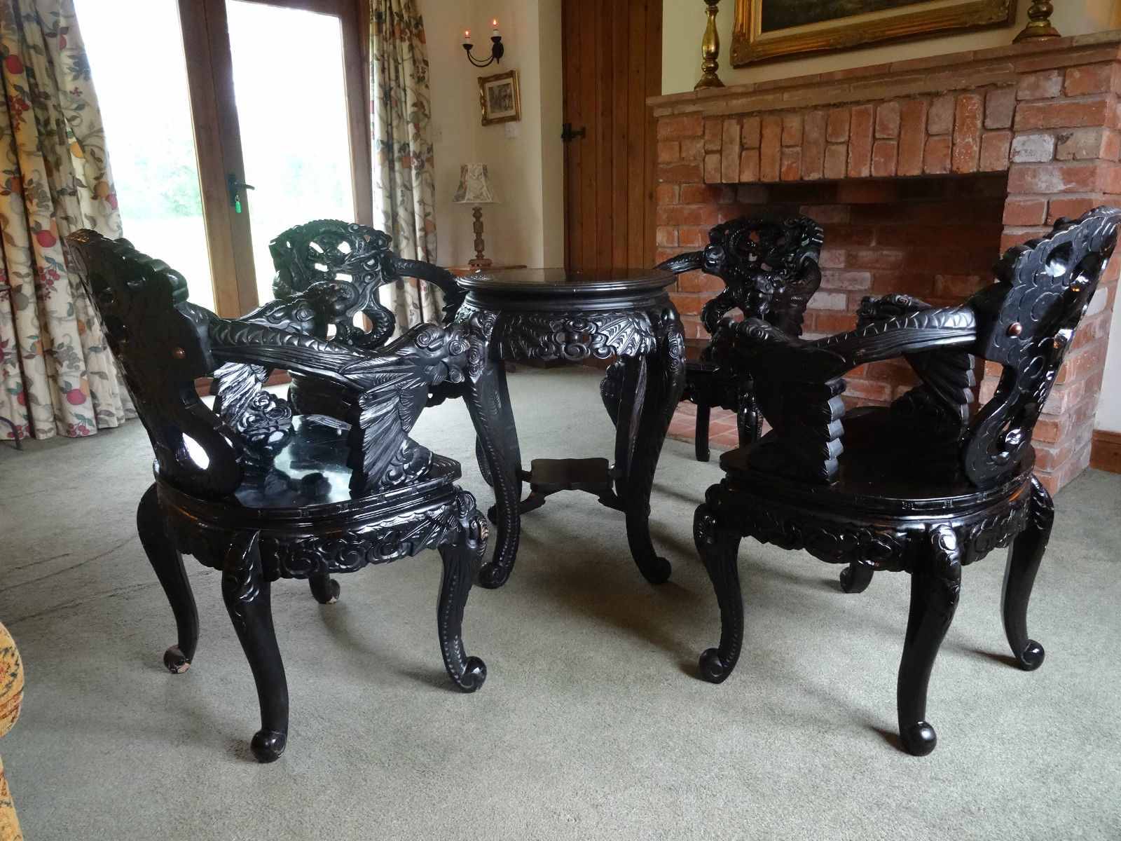 Superb 19th Century Period Antique Chinese Dragon Carved Table & 4 Matching Armchairs