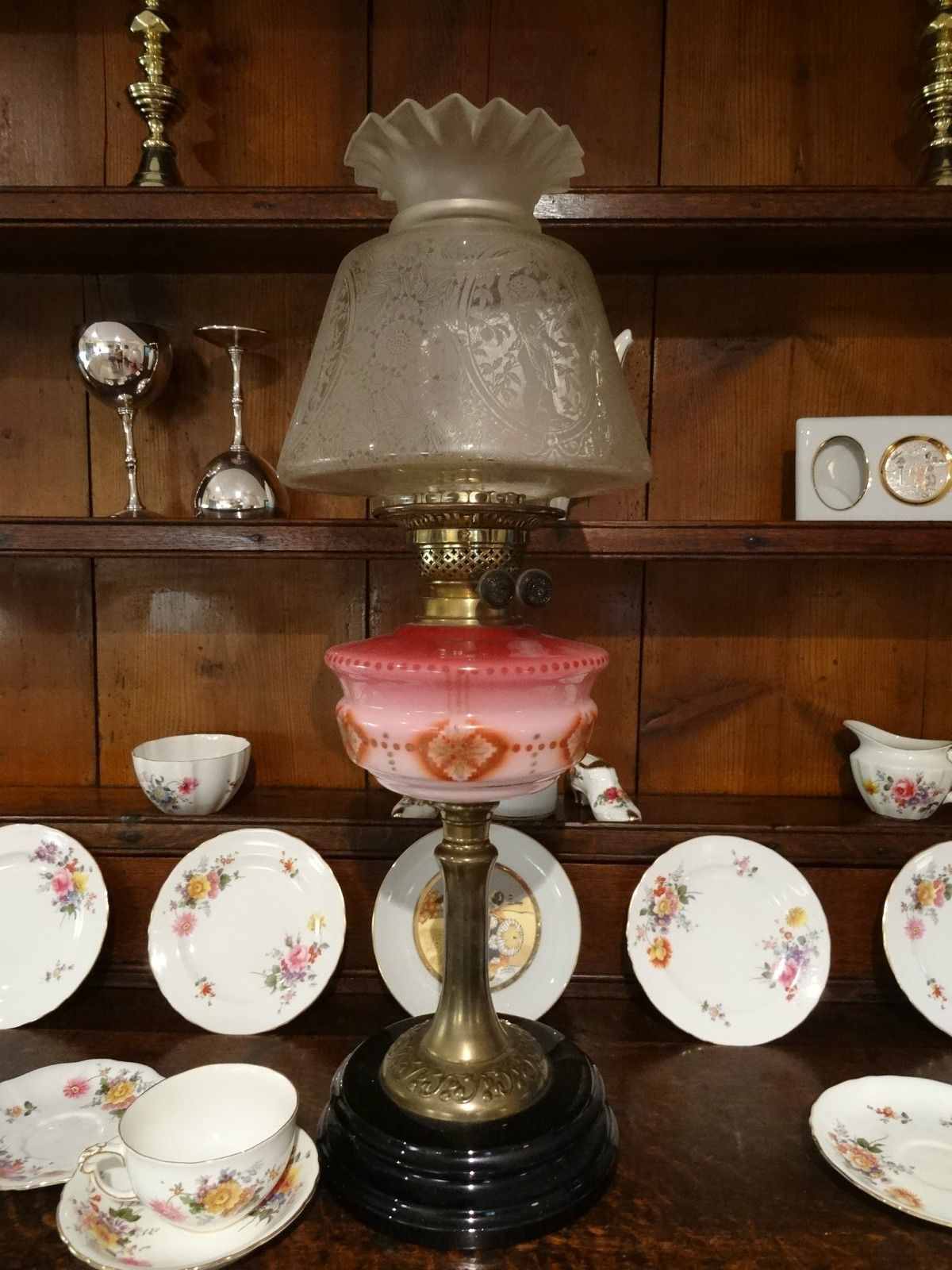 Superb 19thc Victorian Pink Ceramic & Glass Etched Cherub Shade Table Oil Lamp
