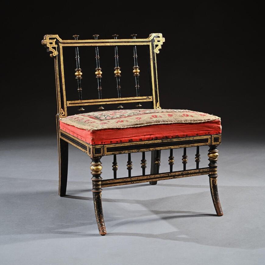 Superb Aesthetic Movement Ebonised Slipper Chair With Original Needle Work Upholstery.