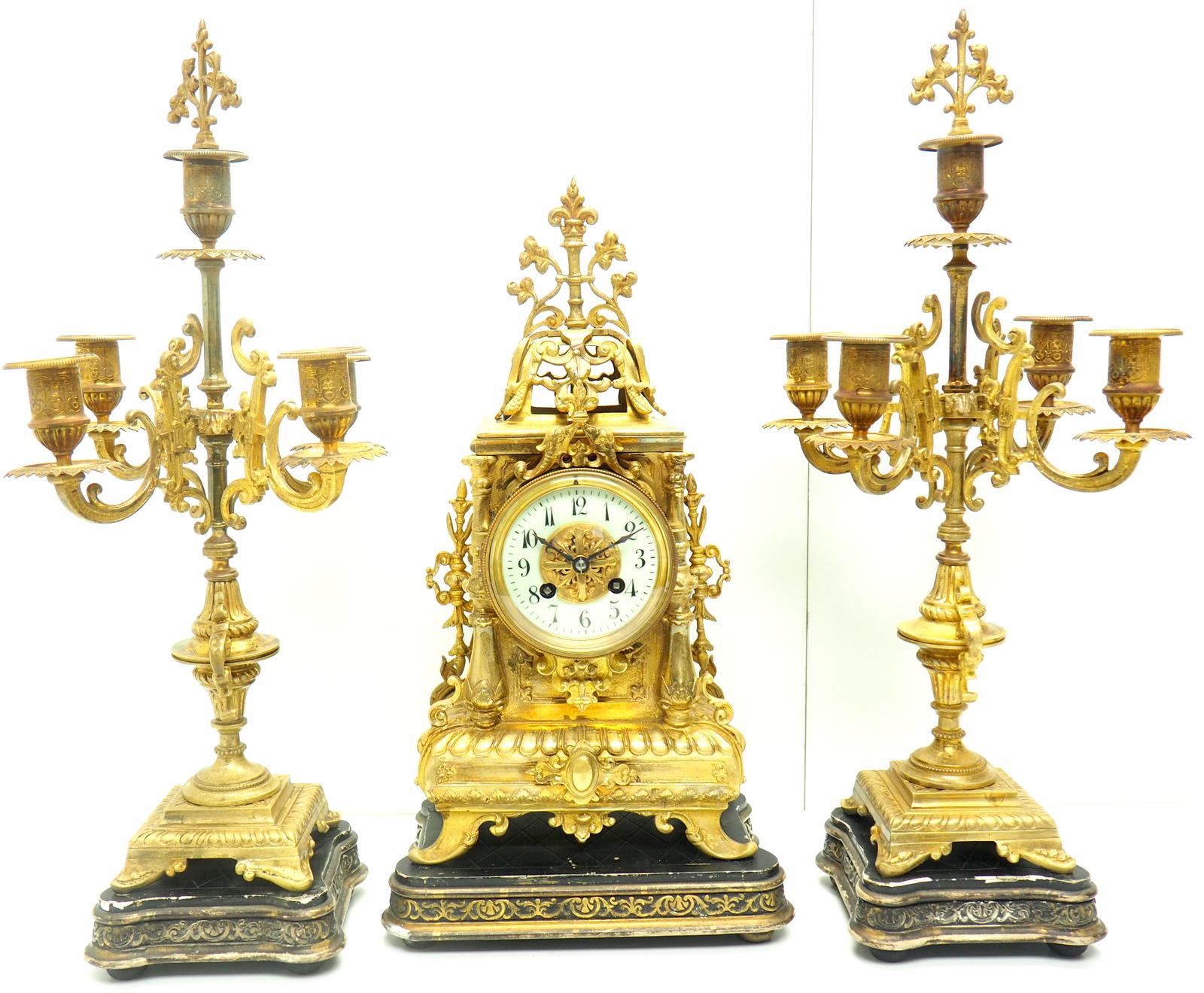 Superb Antique French Ormolu Mantel Candelabra Clock Set Embossed Decoration Finial 8 Day Striking