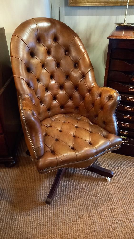 Superb Antique Leather Buttoned Swivel Armchair