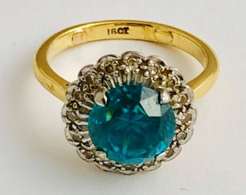 Superb Art Deco 1.75ct Old Cut Blue Zircon & Diamond 18ct Gold Ring