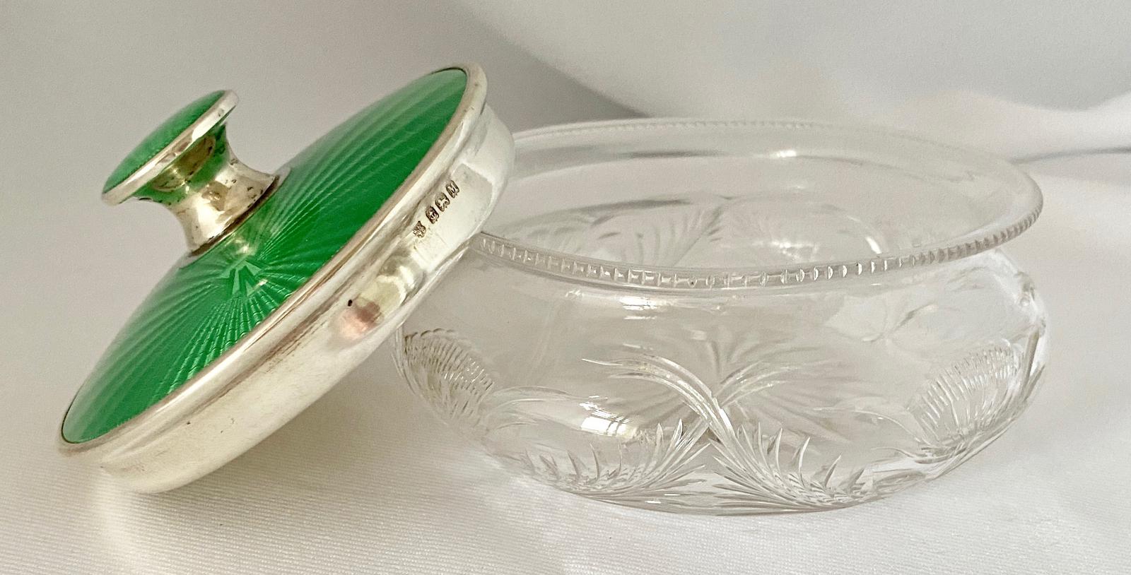 Superb Art Deco Enamel Guilloche Mounted Jar, Birmingham 1936