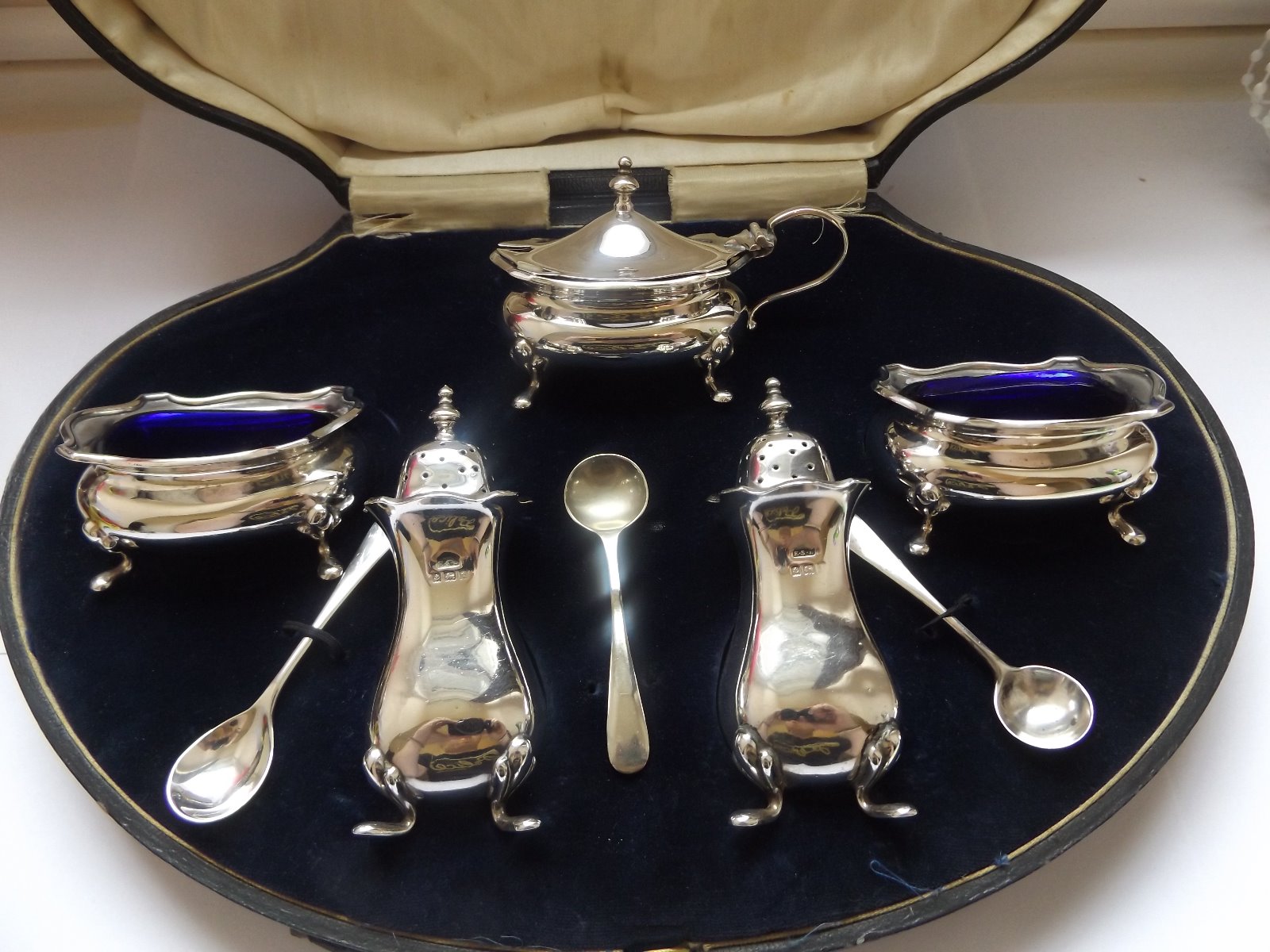 Superb Boxed Hallmarked Silver 5 Piece Cruet Set Birmingham 1918