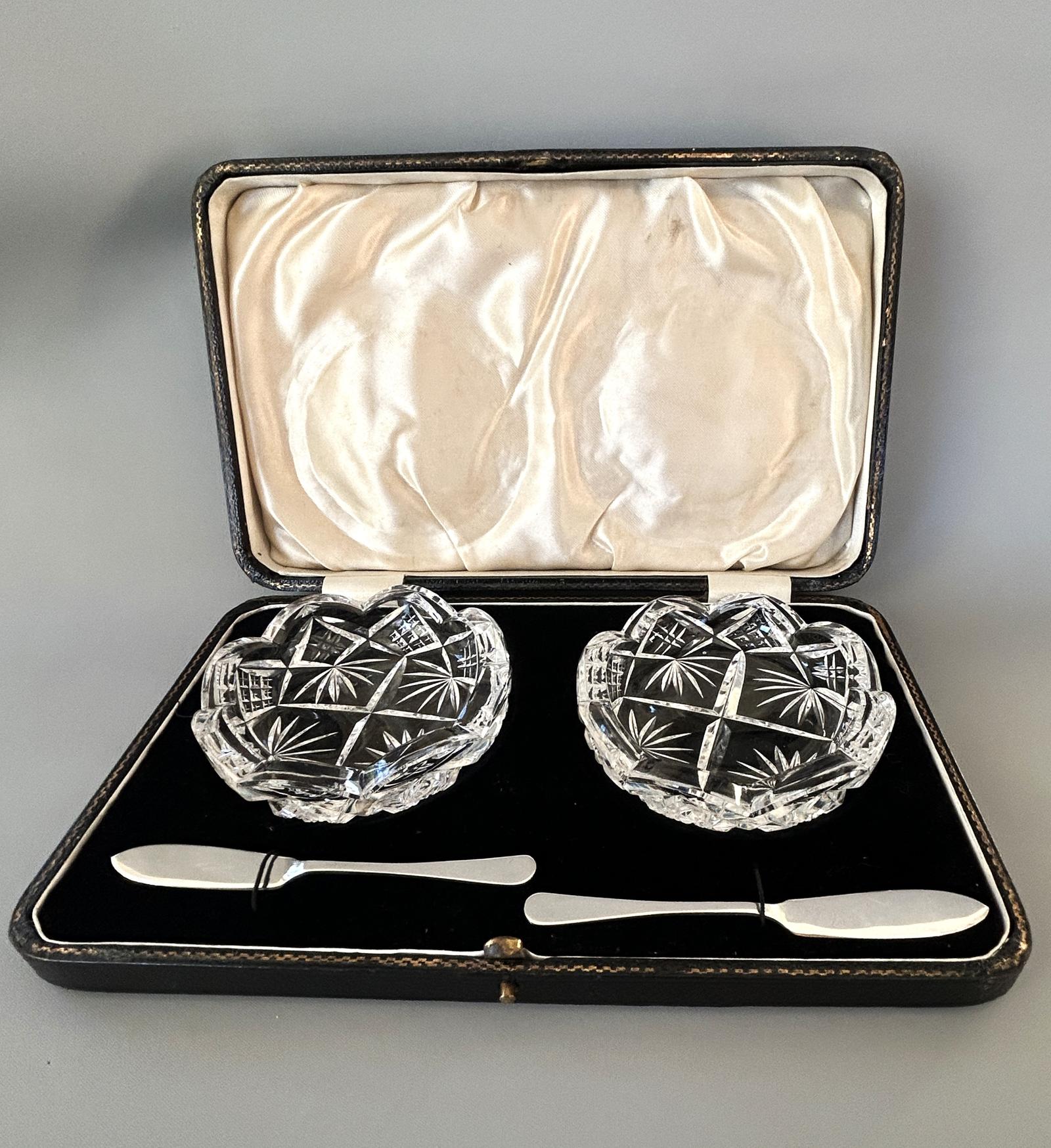 Superb Boxed Pair of Cut Glass Butter Dishes & Silver Knives