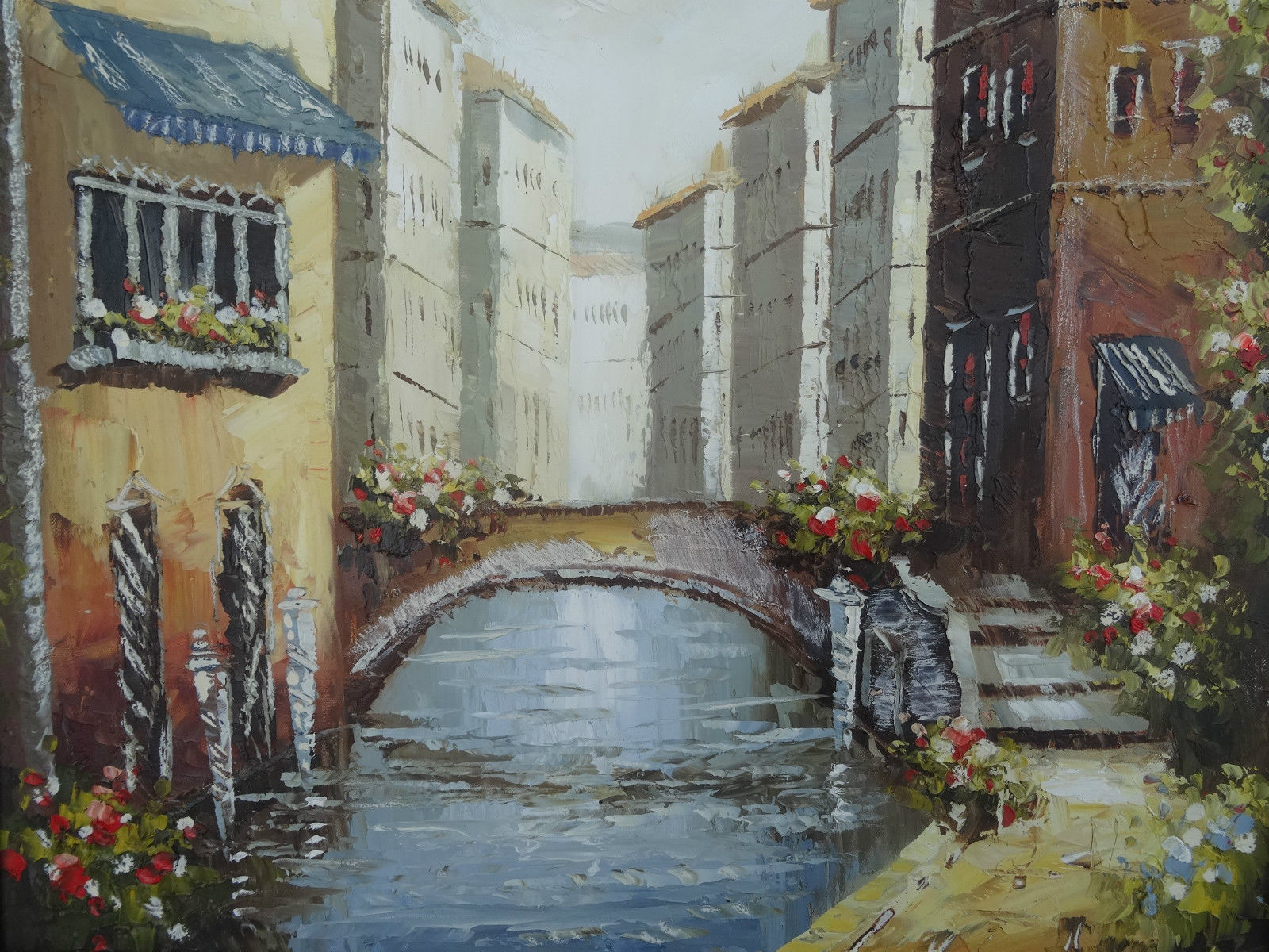 Superb Continental Impressionist Canal Street - Impasto Oil on Canvas Painting