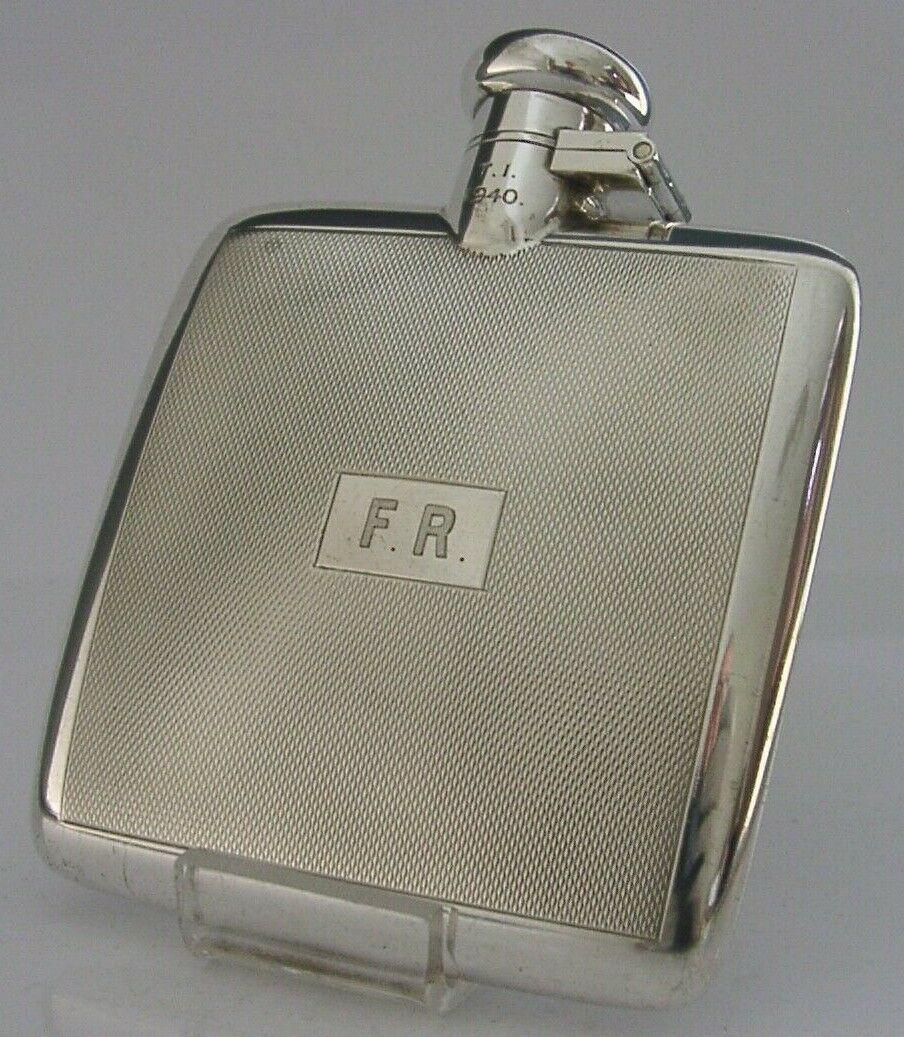 Superb English Solid Sterling Silver Spirit Hip Flask 1940 Art Deco