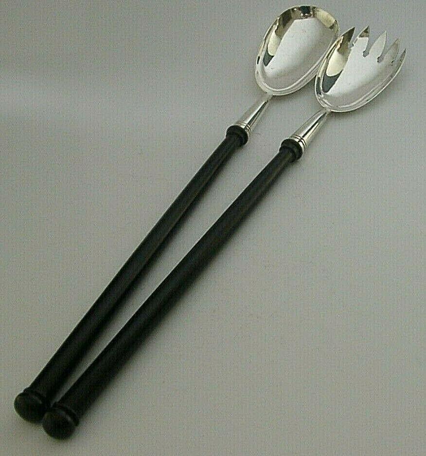 Superb Huge Edwardian Solid Sterling Silver Ebony Salad Servers 1906 Antique