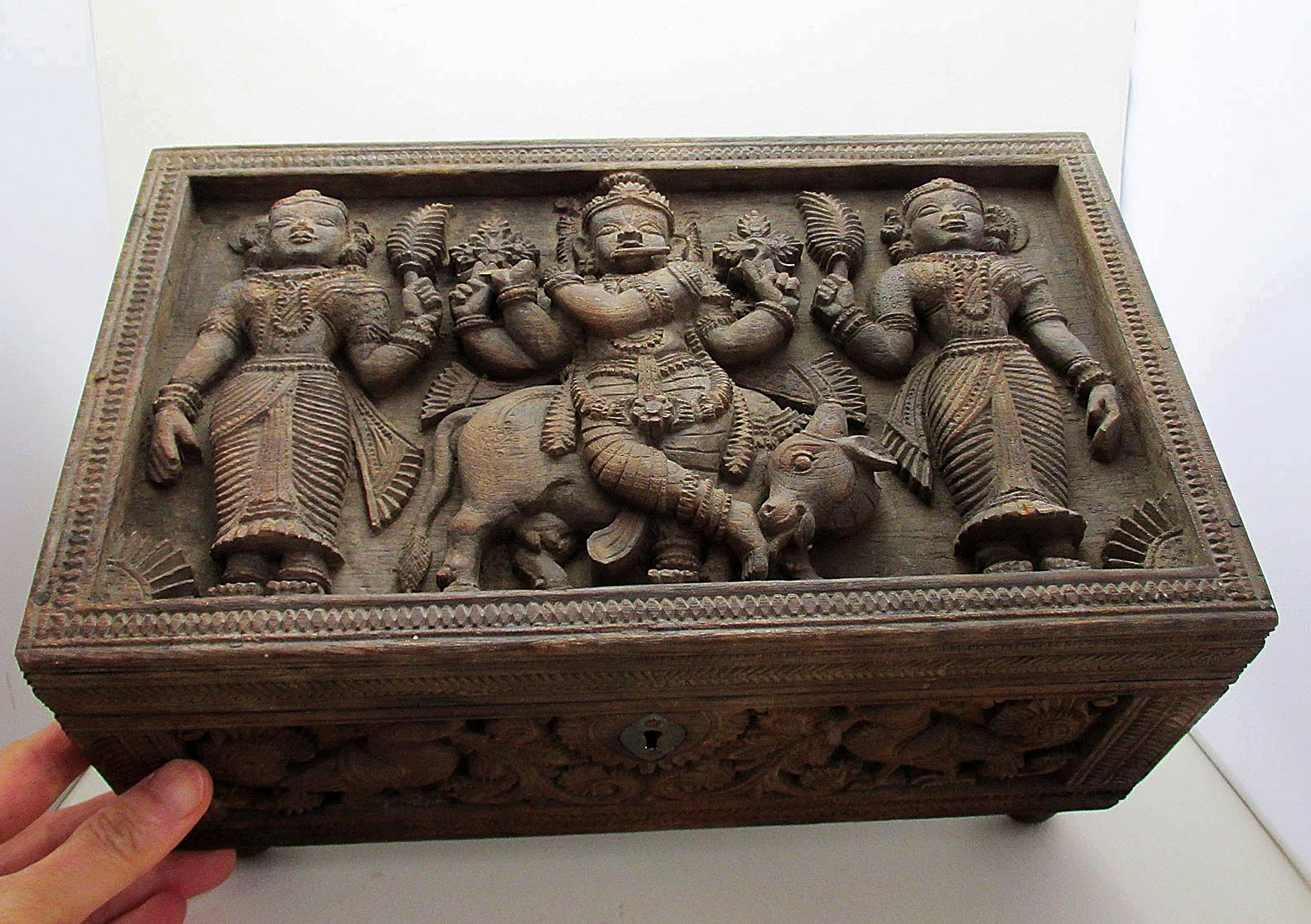 Superb Large 12' Wide Wood 'High Relief' Hand Carved Indian Tamil Nadu Table Box / Casket, Krishna (1 of 11)