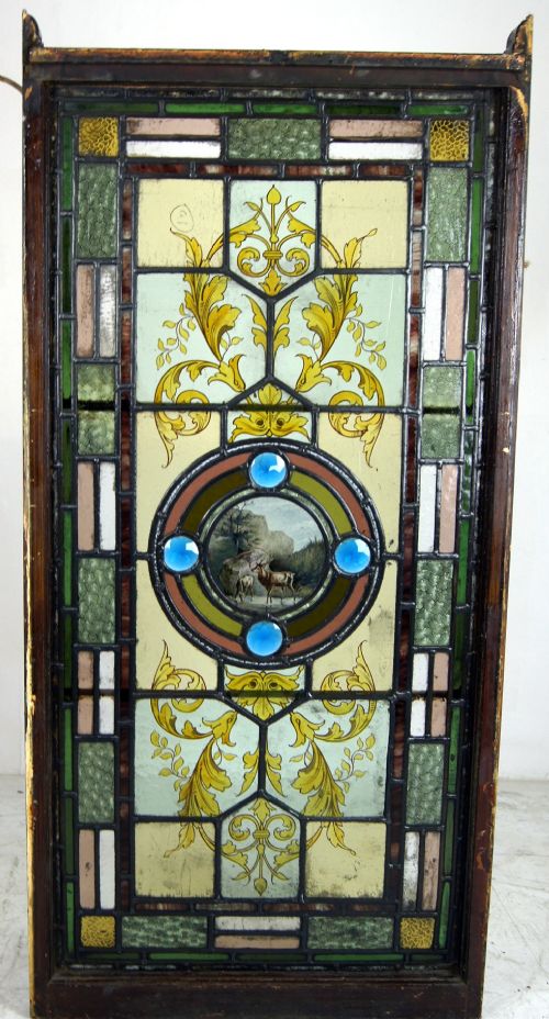 Superb Leaded Glass Window With Multicoloured Borders & Painted Scene