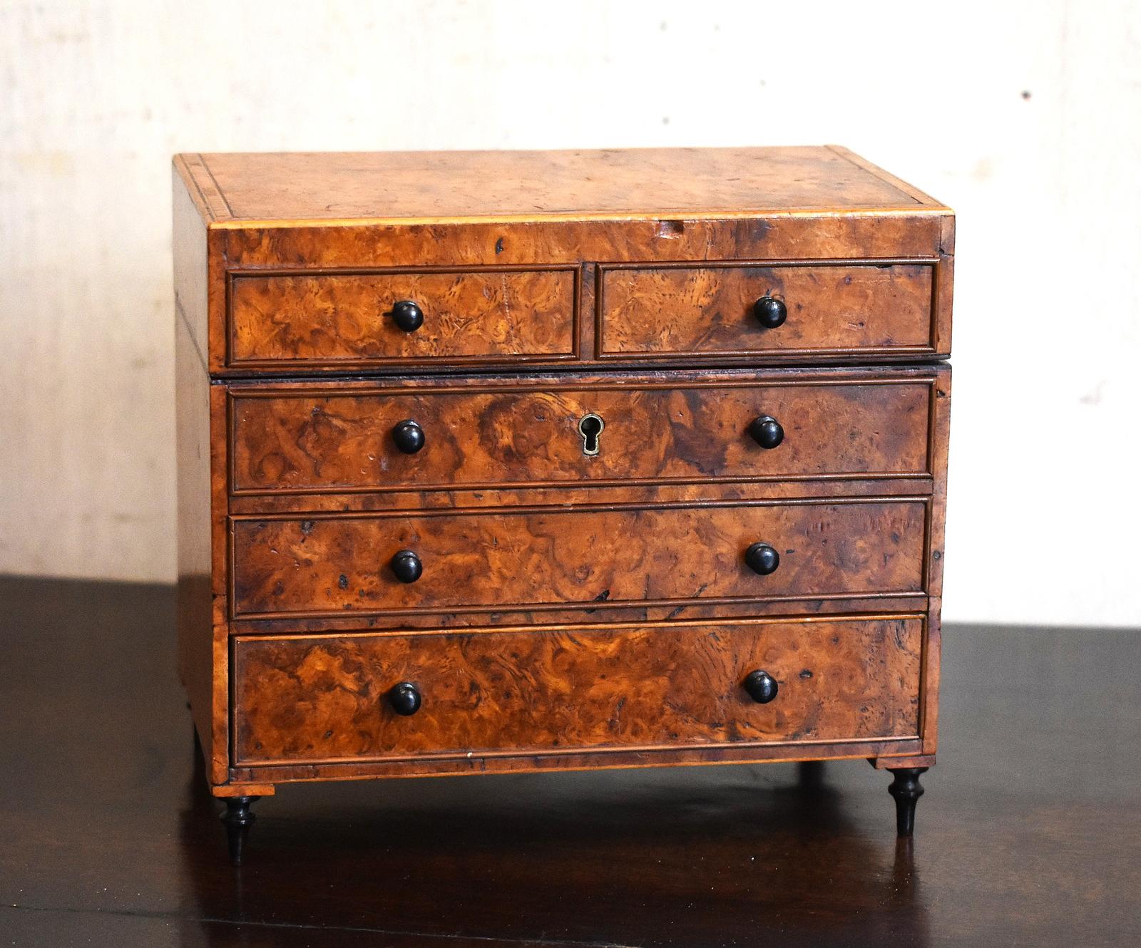 A truly remarkable writing necessaire made as a bur walnut miniature chest of drawers. The piece is of the absolute finest craftsmanship throughout. The chest is veneered in matched bur walnut veneers with each drawer cockbeaded in walnut and with perfectly turned ebonised knobs. The top is edged in boxwood and crossbanded in kingwood. The feet are beautifully tuned and even the pine back has been boarded to perfectly mimic a standard sized chest. The miniature chest actually hides writing implements, with the lid lifting to reveal two inkwells and a catch releases the lowest drawer which contains writing implements. The piece is difficult to accurately date though it certainly dates to the nineteenth century, the chest design is late Regency. The piece is one of the finest pieces of miniature cabinet work I have seen and also an extremely rare and unusual writing item.