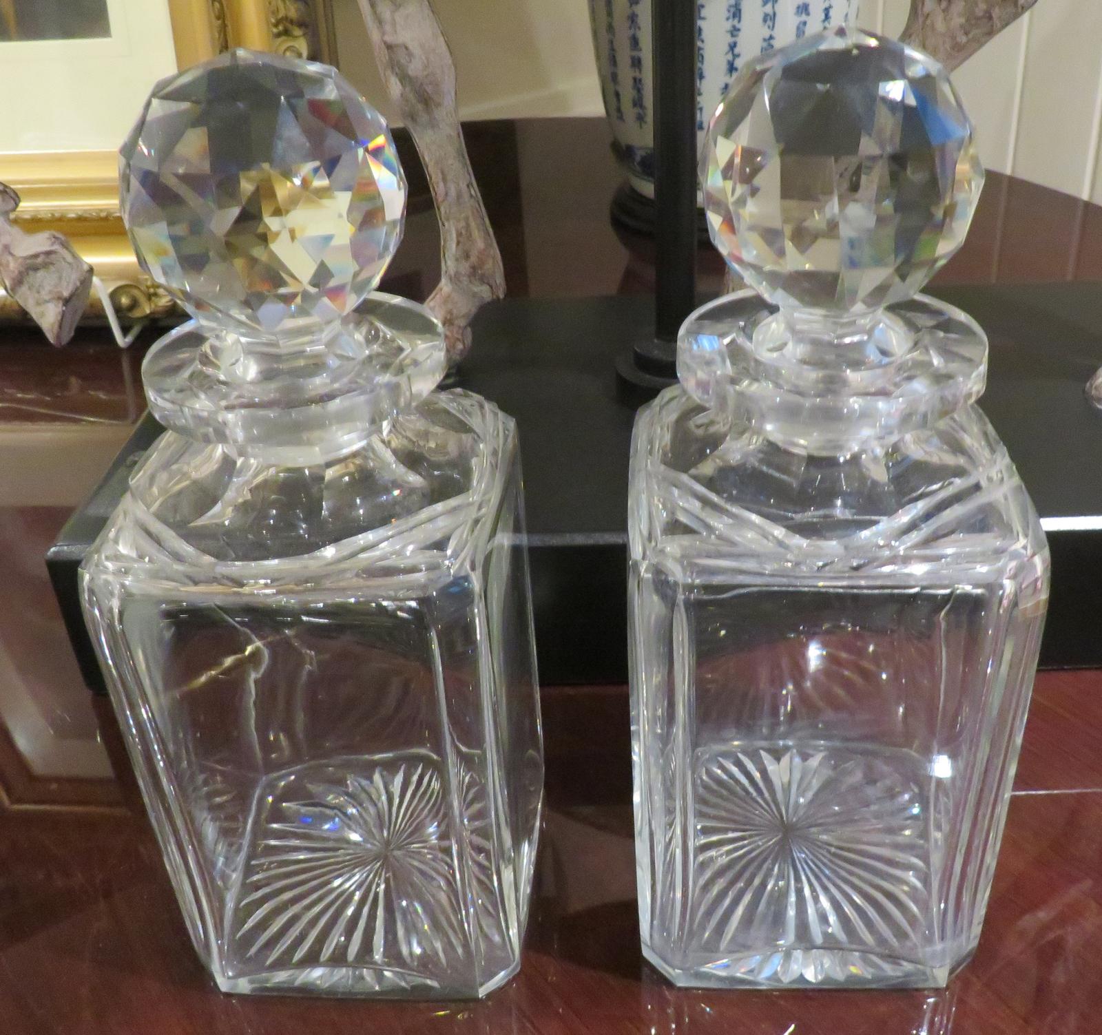 EXTREMELY HEAVY, A SURE SIGN OF THERE QUALITY. THEY COME WITH THEIR ORIGINAL FACETED STOPPERS. THE BASE HAS OF EACH WITH STAR CUT DESIGN. THEY BOTH HAVE THE ODD SCRATCH WHICH IS TO BE EXPECTED, ONE DOES HAVE A COUPLE OF CHIPS ALONG ONE OF THE SHOULDERS AND THE END OF THE STOPPERS TYPICALLY HAVE MINUTE CHIPS AGAIN PART OF ITS AGE AND USAGE.