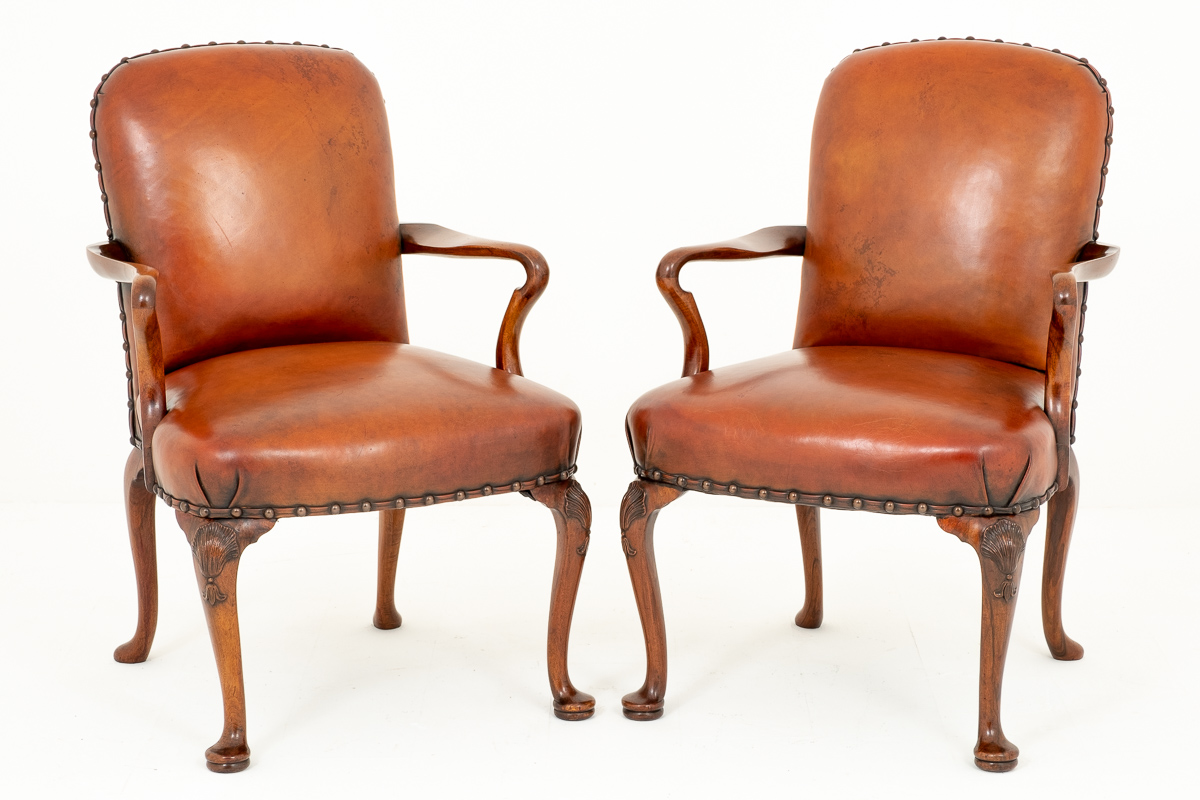 Superb Pair of Queen Anne Style Leather Open Armchairs
