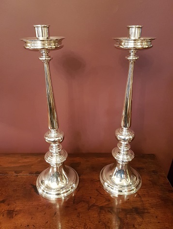 Superb Pair of Tall Antique Silvered Church Candlesticks