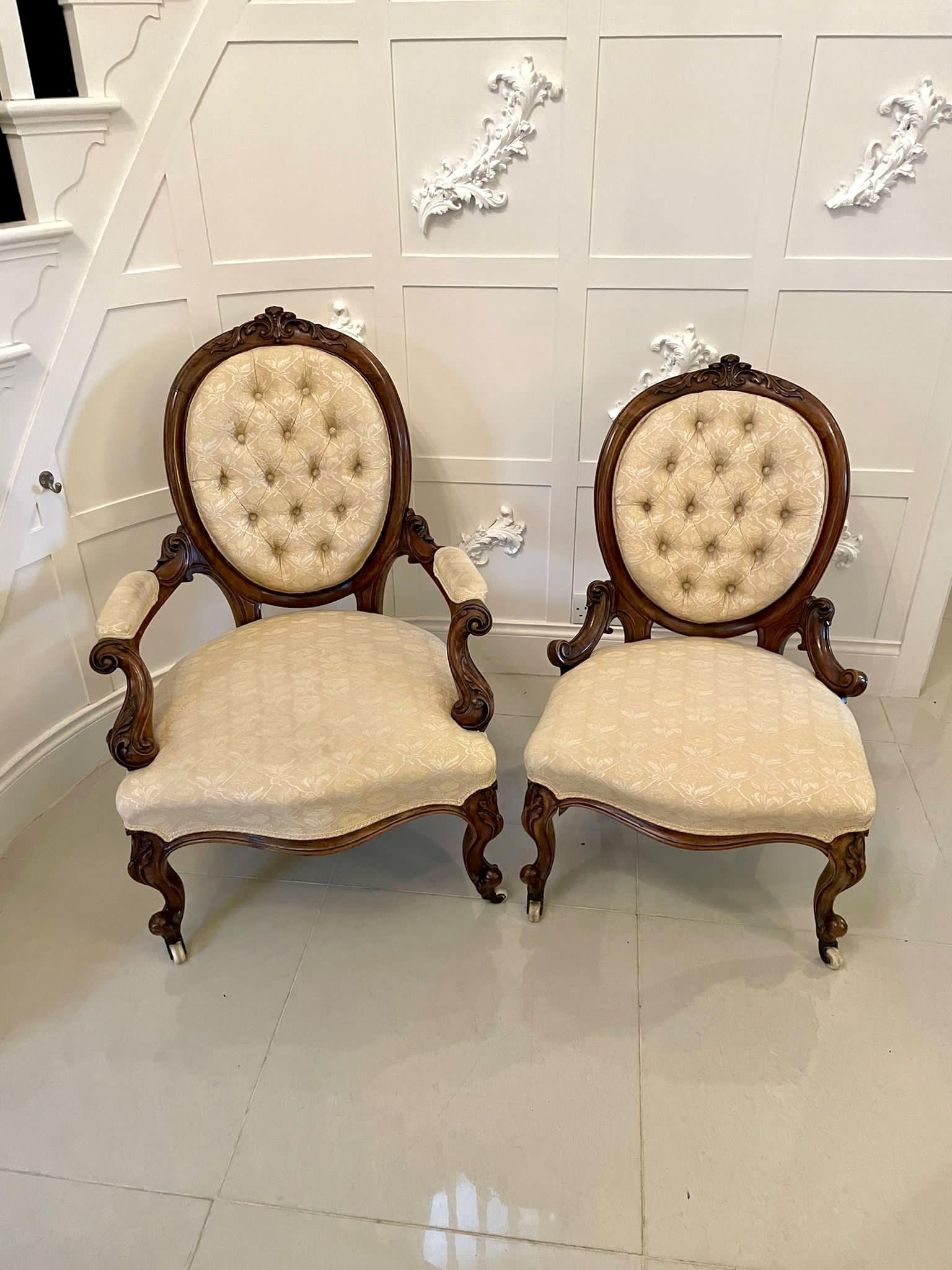 Superb Quality Antique Victorian Pair of Walnut Framed Ladies and Gentlemens Chairs