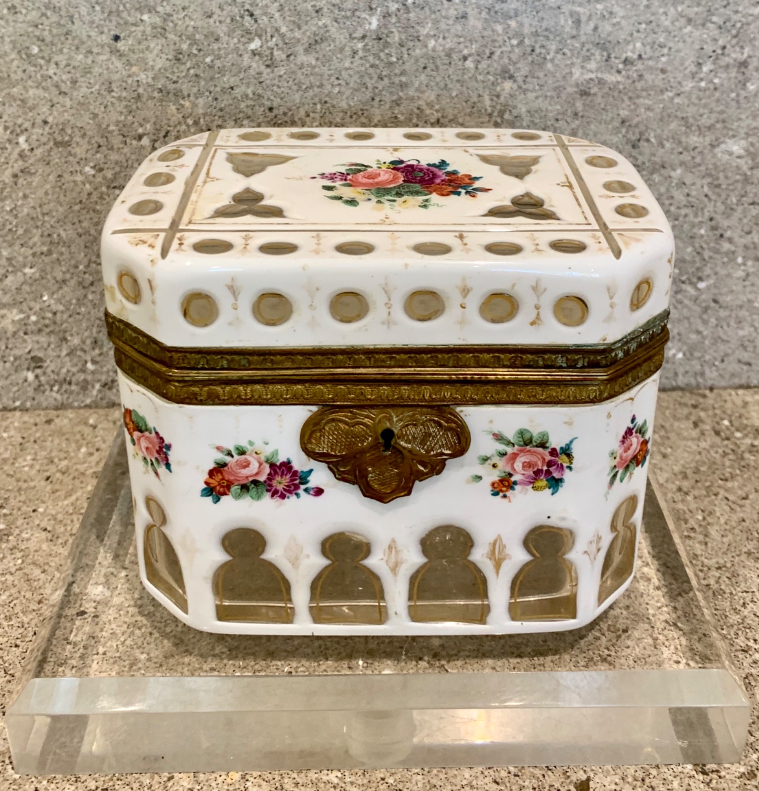 Superb Quality Bohemian White Overlay Floral Enamelled Casket / Box