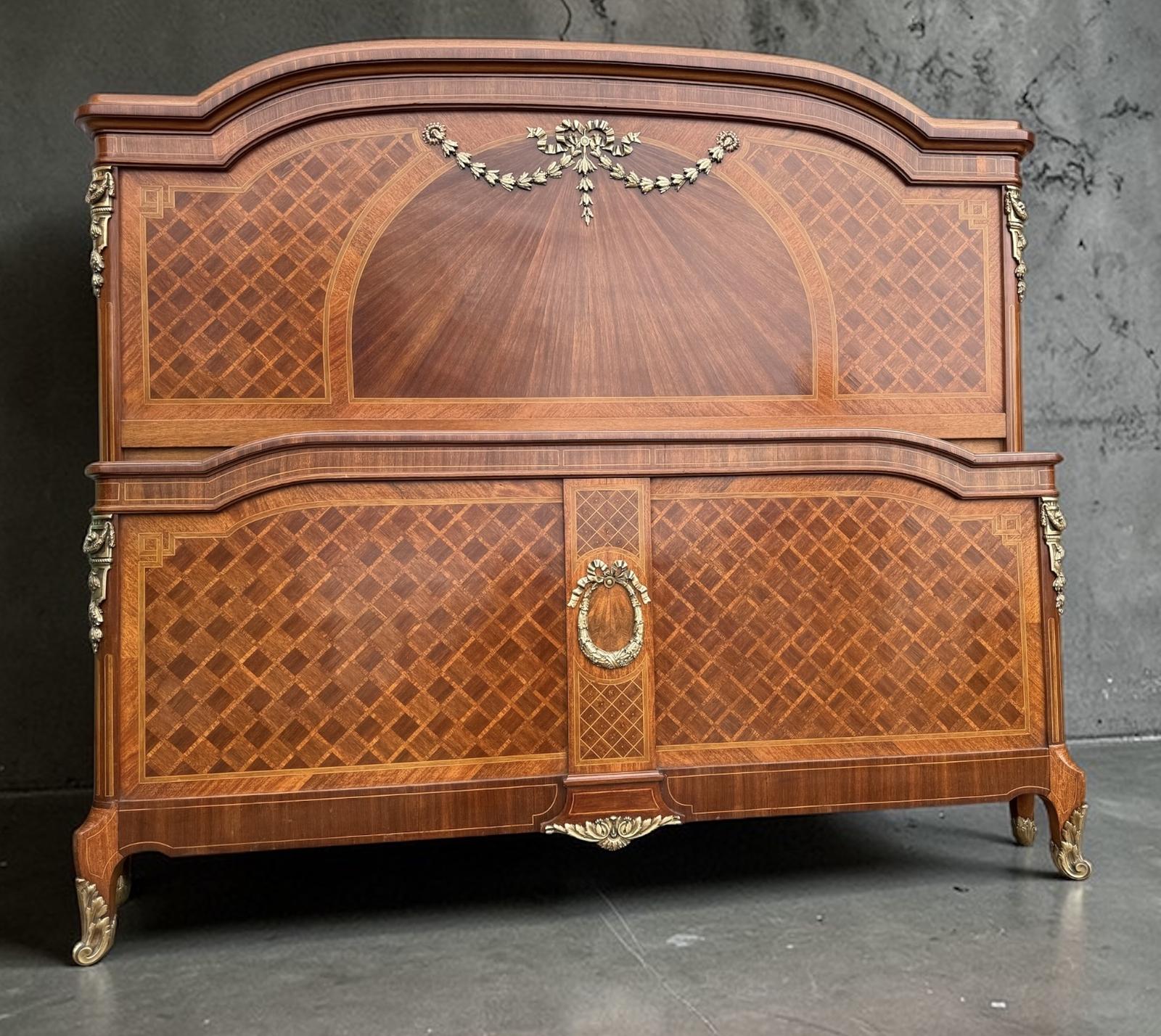 A superb quality late 19th Century King-size bed, with extensive parquetry inlay of exotic woods, with we'll cast ormolu appliqués and feet. All recently cleaned and waxed, emphasizing the wonderful colour of the timbers. This bed comes with headboard, footboard and side rails, which have been stretched to accommodate a modern King-size mattress. The bed actually measures 170 centimetres wide, larger than normal so will comfortably accommodate a modern King-size mattress. The rails have been modified to accommodate slats to support a mattress ( which can be supplied if required)..