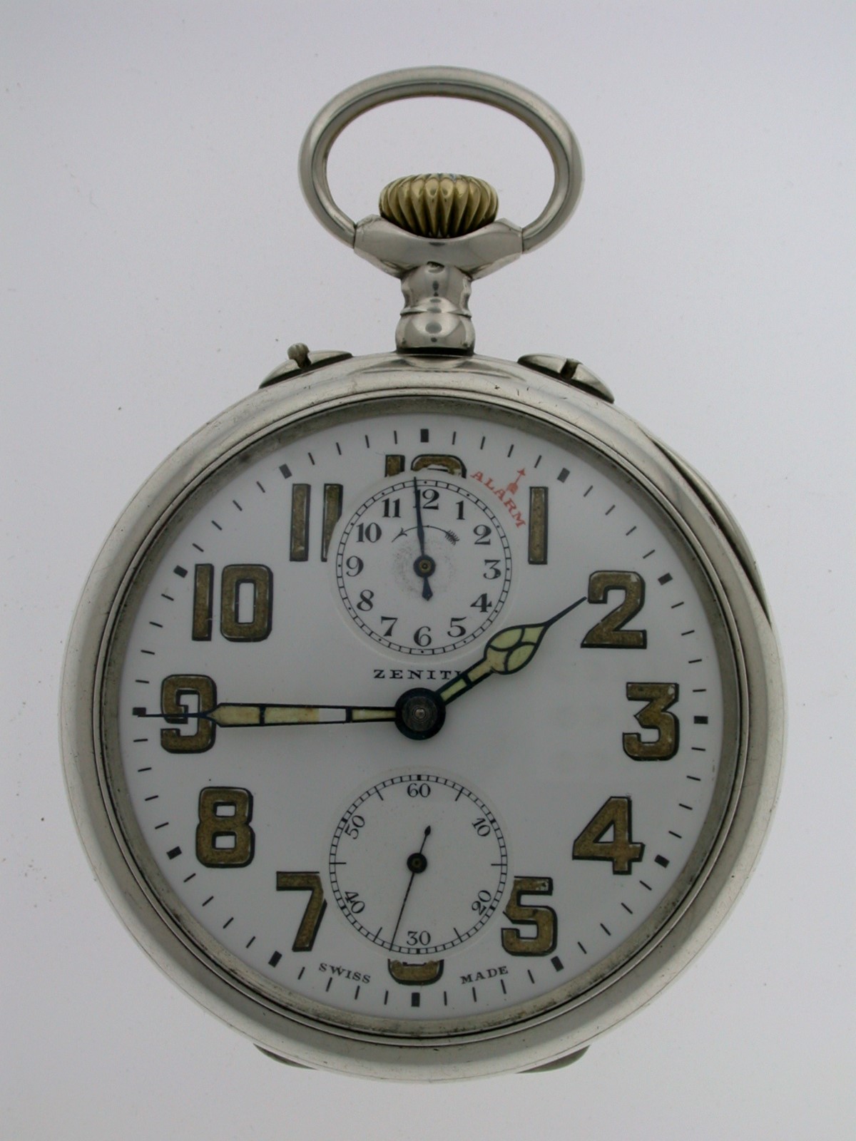 Superb Rare Alarm Silver ZENITH 0.800 Open Face Swiss Pocket Watch 1900