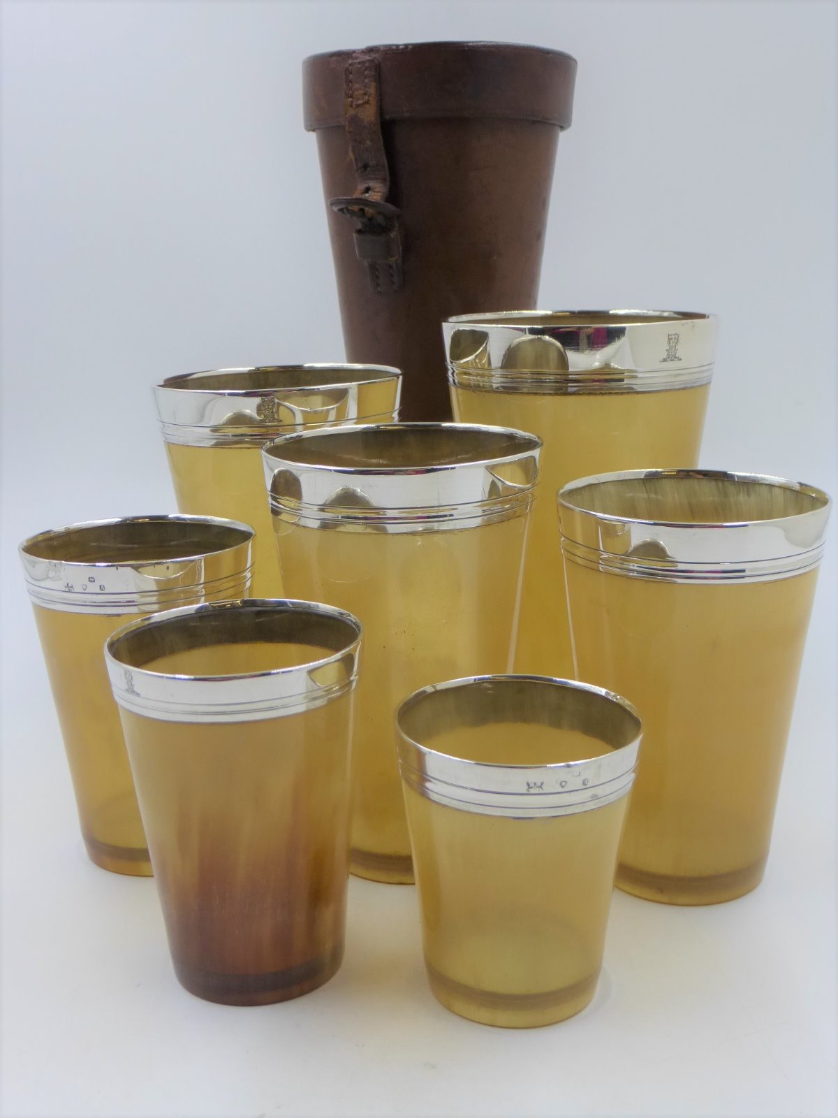 Superb Set of 7 Antique Victorian Silver Mounted Horn Beakers. London 1876