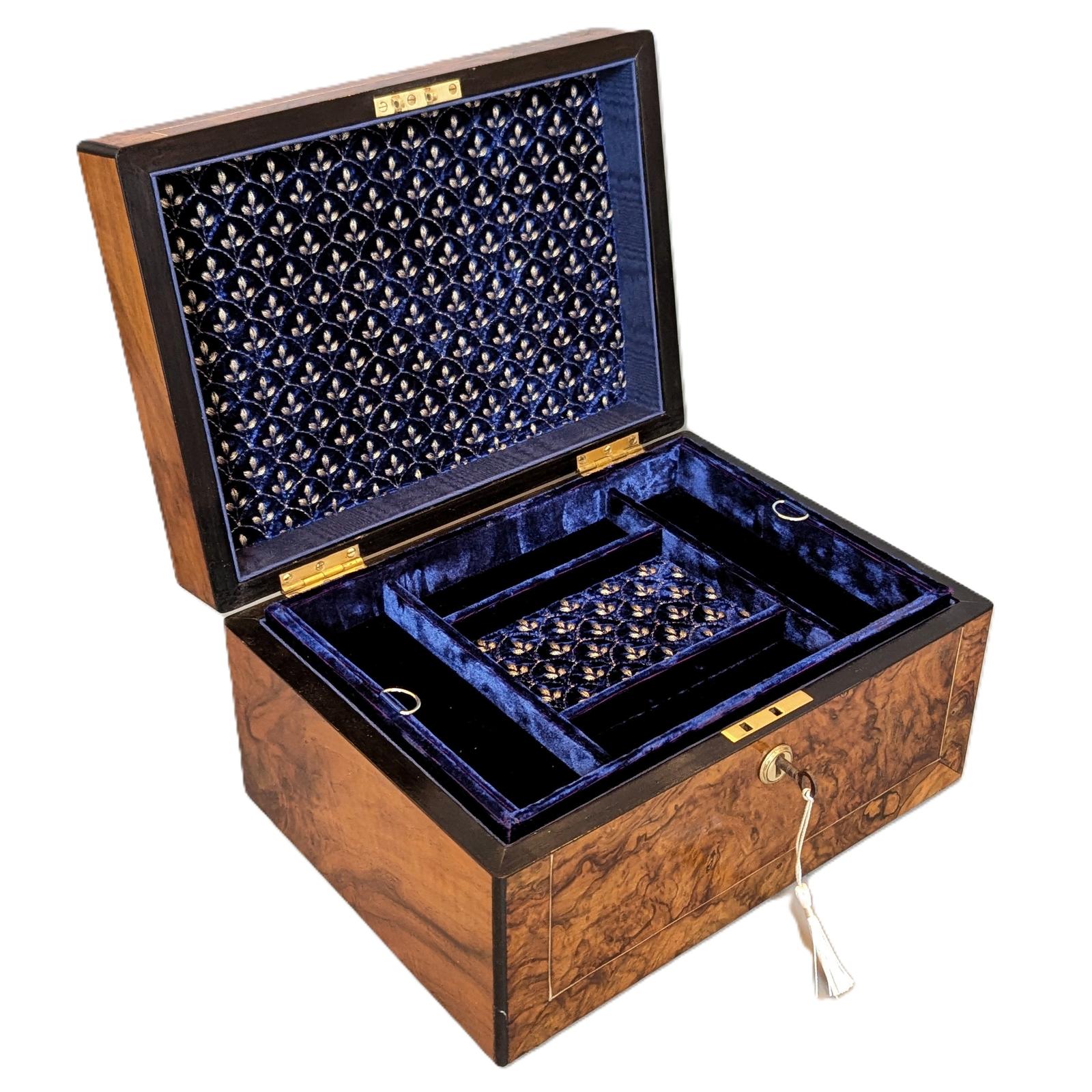 Superb Victorian Burr Walnut & Brass Inlaid Jewellery Box