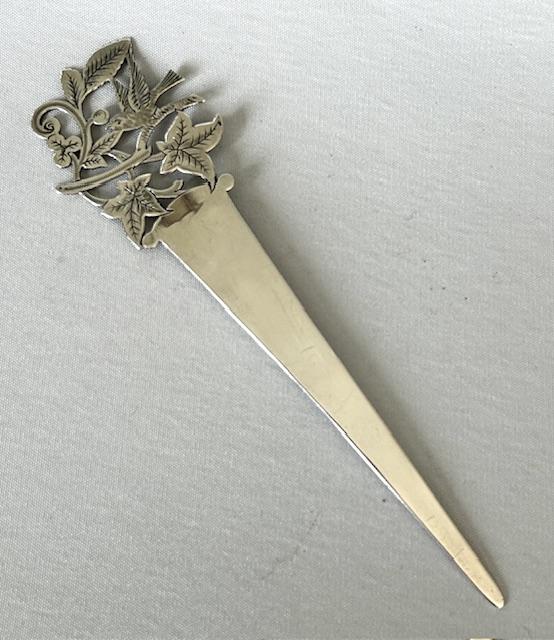 A superb late Victorian silver letter opener/bookmark combo. The long blade is fully hallmarked and the finial is an openwork design with engraved details featuring twigs, leaves and a bird - all beautifully detailed. A wonderful gift idea with a practical use.