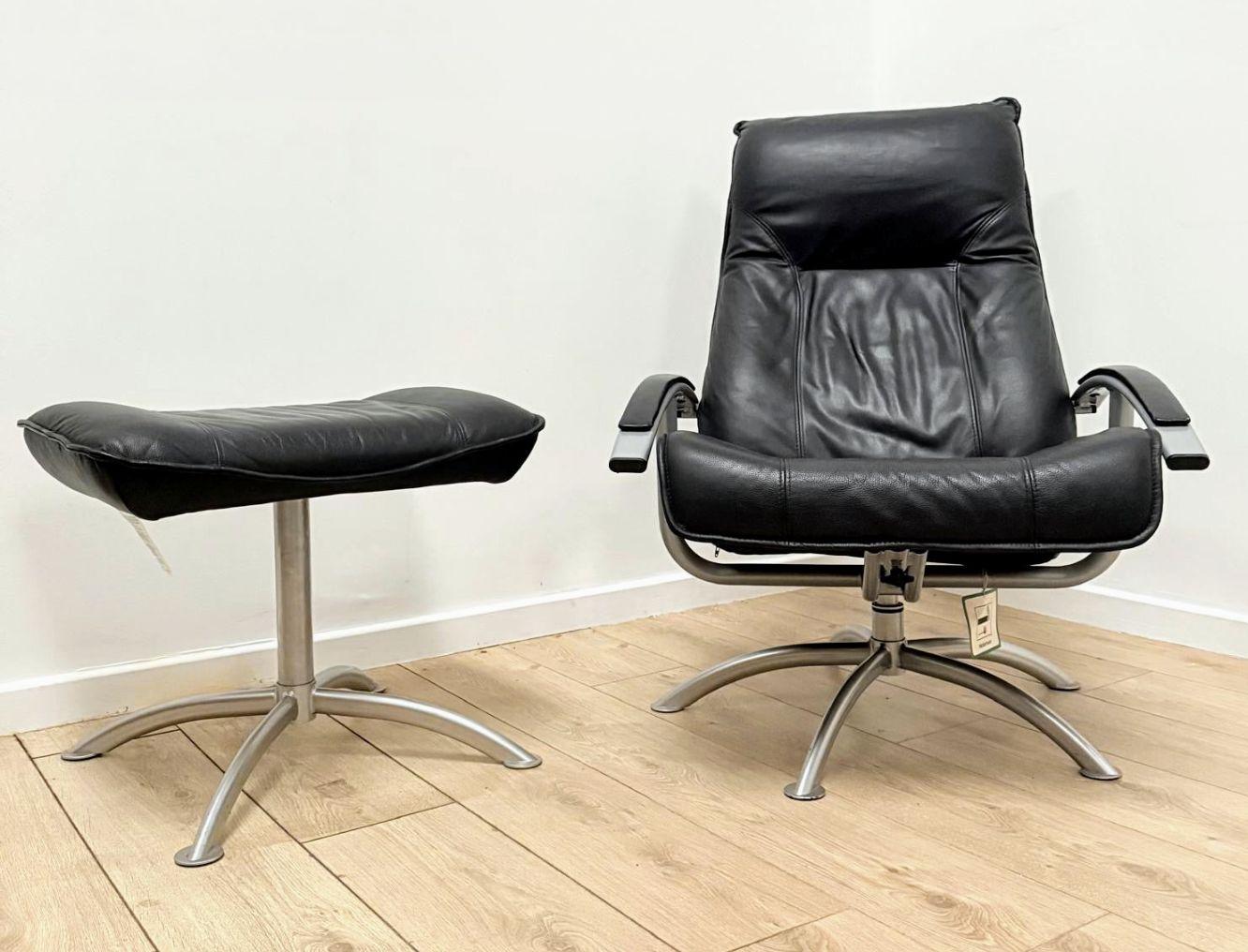 This superb vintage Danish Kebe black leather swivel recliner with ottoman footstool is a must-have for any collector or lover of retro furniture.