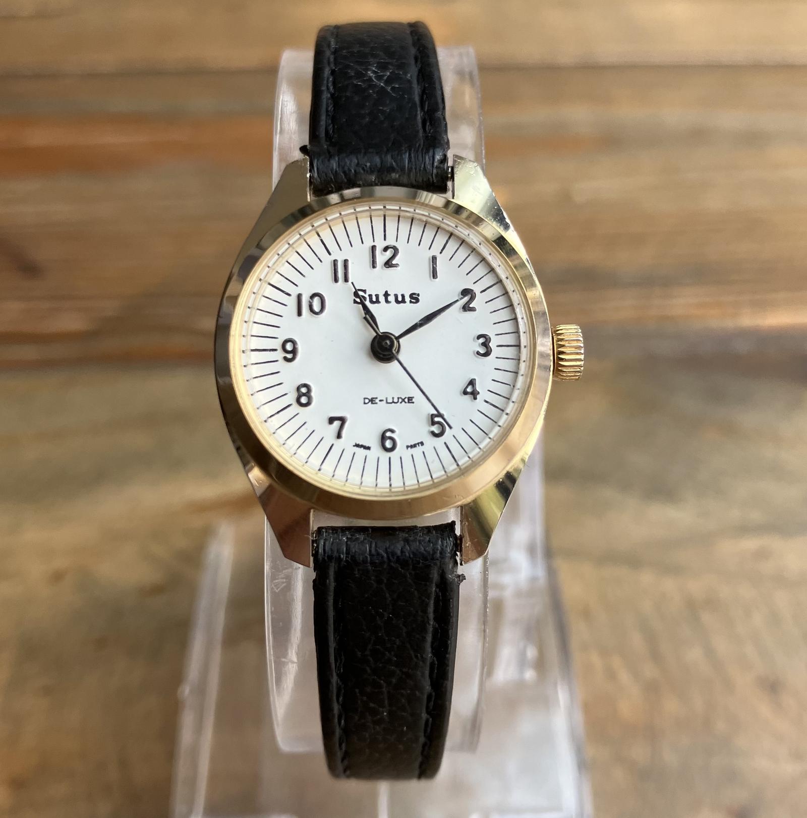 A vintage Sutus ladies’ manual wind wristwatch featuring a gold-plated case with a leather strap.