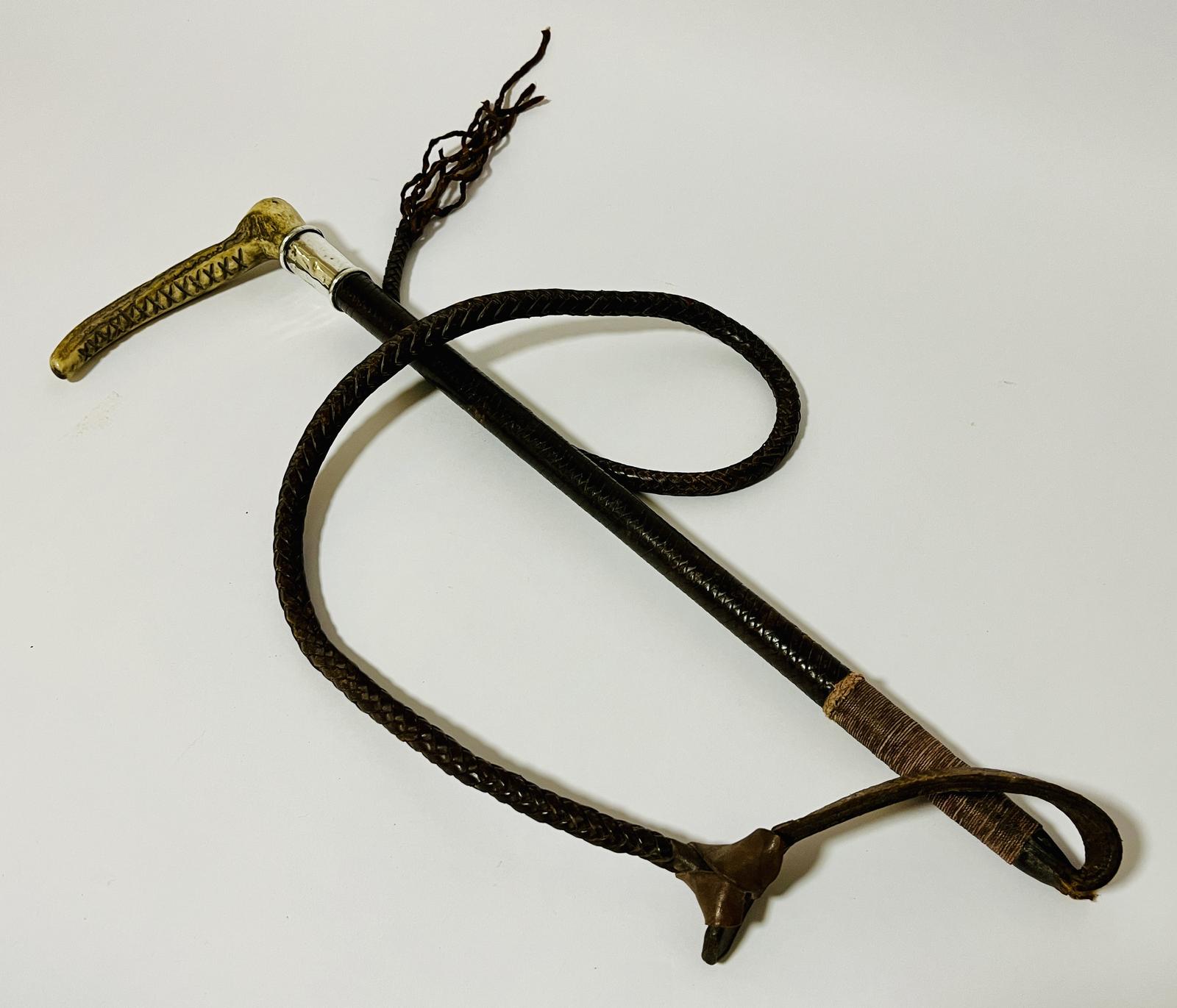 A good example of a silver mounted hunting whip by Swaine Adeney. It has a traditional carved antler handle with an inset silver button stamped with the makers name and it has a silver collar hallmarked for London 1912. The whip has a plaited leather shaft with short leather keeper on the end and a longer plaited leather thong attached.