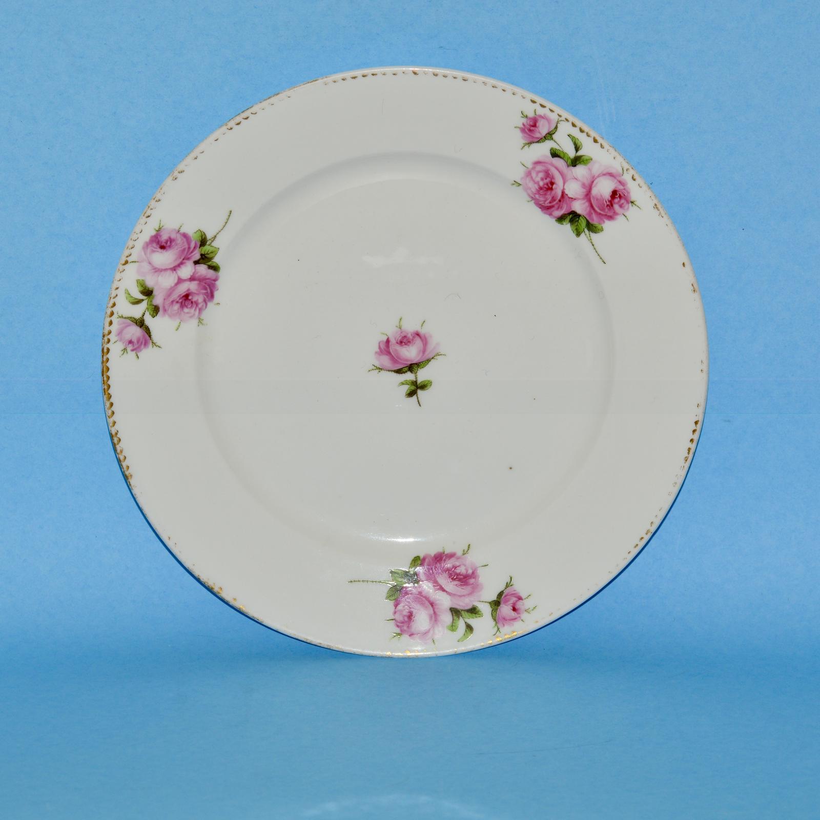 It is delightfully painted with scattered sprays of pink roses, with a gilt dentil rim.