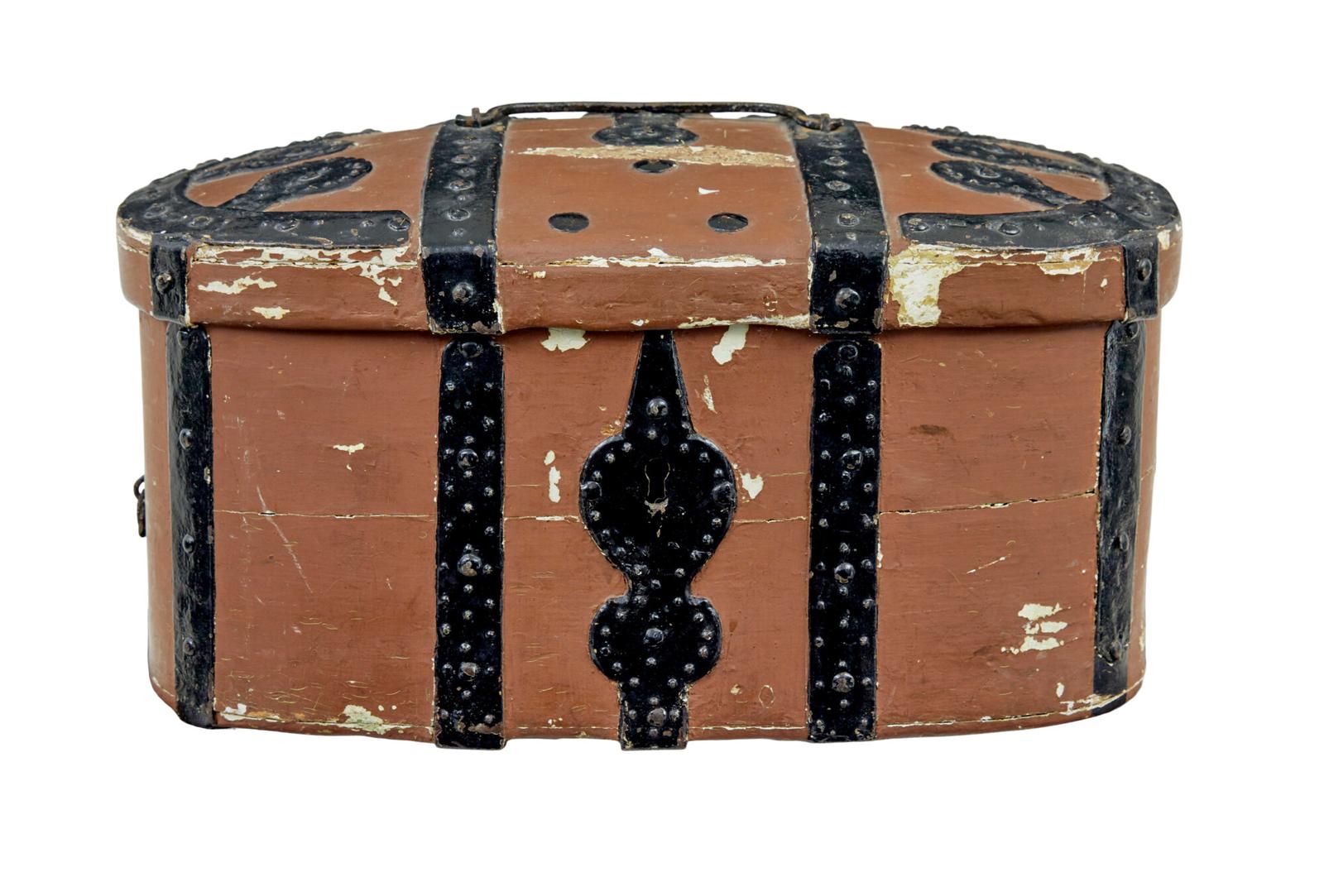 Swedish 19th century brown painted shaped strong box circa 1860. An example of the traditional swedish shaped strong box with domed lid. This example has been painted in a vivid brown paint with the metalwork painted black, lid opens to reveal an vivid blue interior. Lock no longer present so a good decoration piece. Minor losses to metalwork around the base. Expected surface marks and fading, cracks and losses to paintwork.
