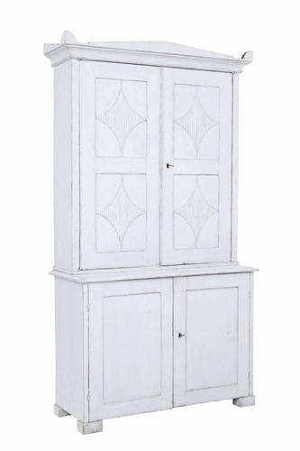 Swedish early 19th century painted cupboard circa 1820. Fine quality 2 part cupboard, ideal for kitchen or multiple rooms around the house. Top section with architectural cornice, decorated with fluted recessed panels to the doors. Opening on the key to reveal a partially fitted interior of 3 shelves and 2 drawers. Bottom section opens on the key to reveal 2 fixed shelves. Standing on block feet. Expected wear to paintwork and minor surface marks. Evidence of very minor dead inactive treated worm.