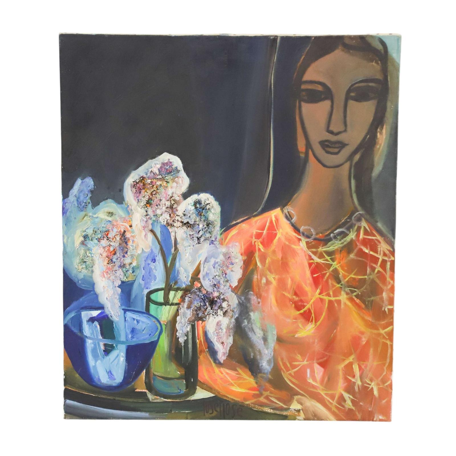 This expressive mid‑century oil painting by Josef José is a captivating blend of portraiture and still life. Painted in the 1960s, it reflects the era’s fascination with stylised human forms, bold colour and emotional presence.