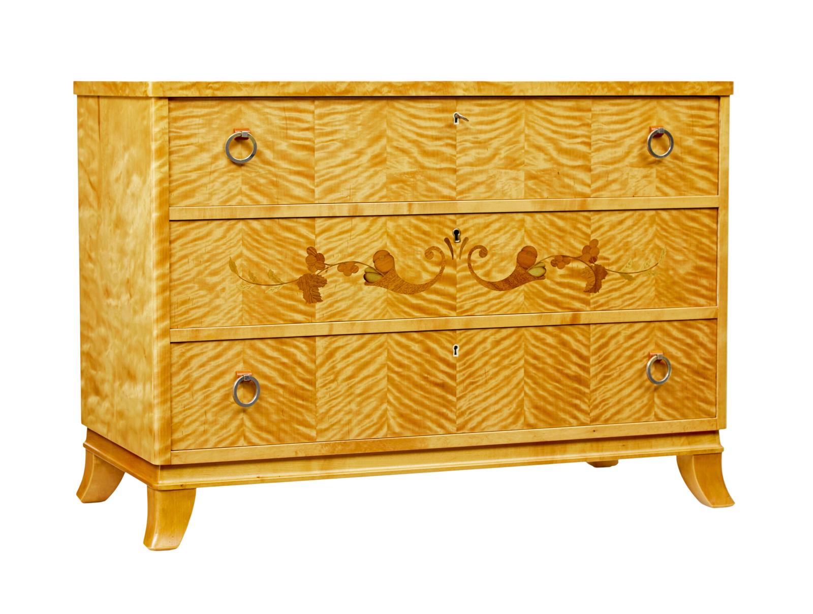 Swedish mid century inlaid birch chest of drawers circa 1950. Good quality mid century chest of drawers which is strong with an art deco influence. Rectangular shaped top with front rounded edges. fitted with 3 drawers of equal proportion. top and bottom drawers fitted with chromed ring handles. middle drawer beautifully inlaid with cornucopia and swags, using various woods. standing on 4 tapered legs. working locks with key. Recently re-polished in our workshop by hand, maintaining it's rich golden colour. ready for everyday use.