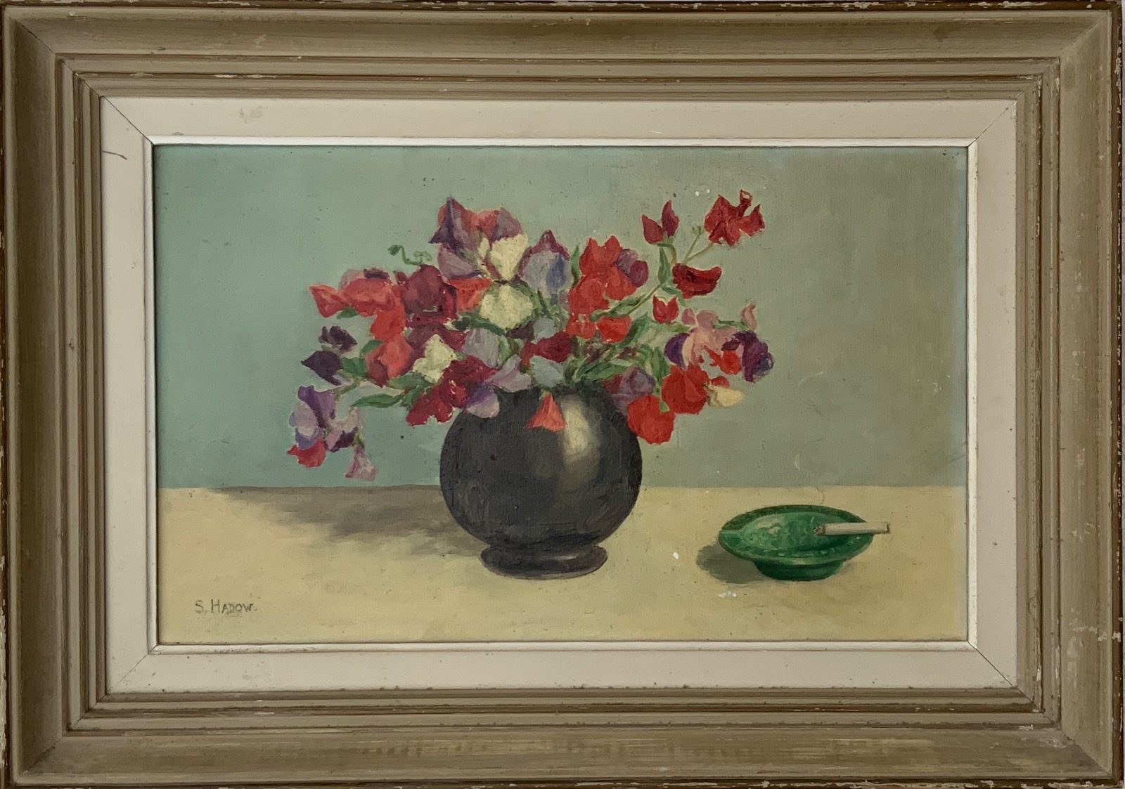 'Sweet-Peas' French Mid Century Original Oil Painting Signed - Original Frame