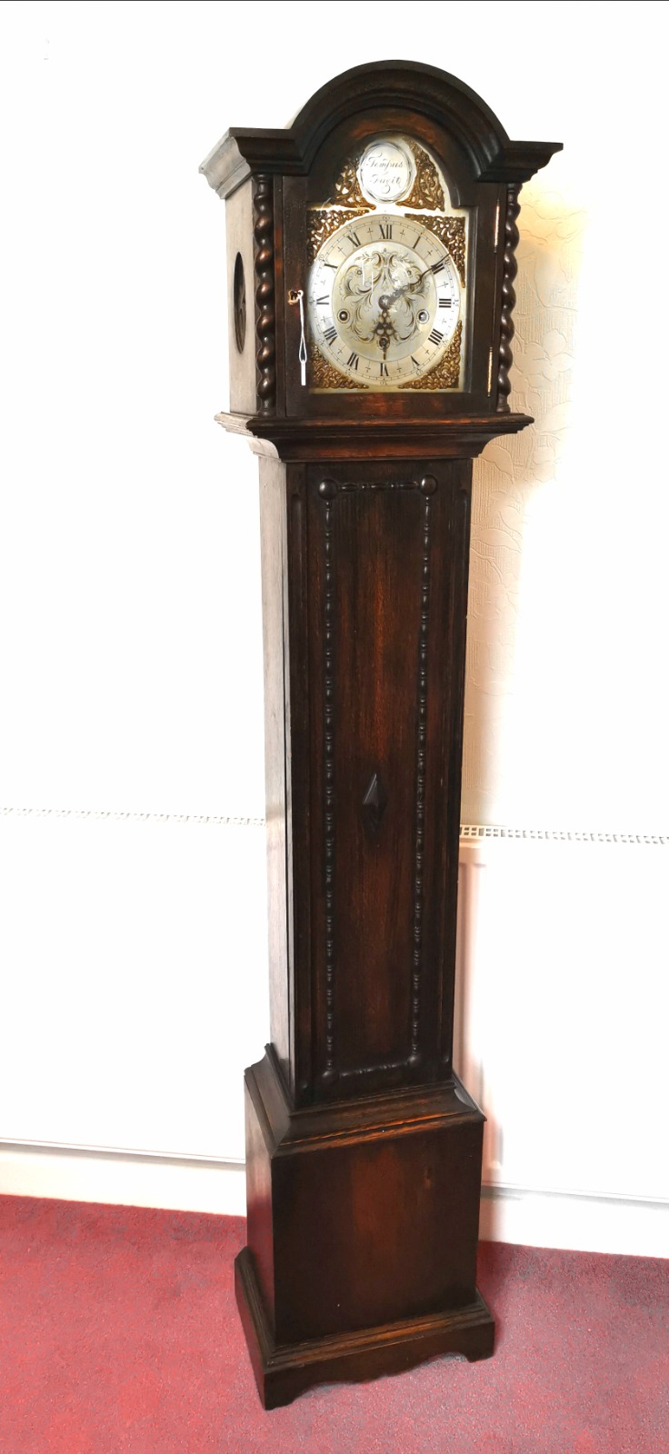 Sweet Sounding English Early 20th Century Oak Petit Grandfather or Grandmother Longcase Clock Striking the Hours & Playing Musical Chimes on Each Quarter