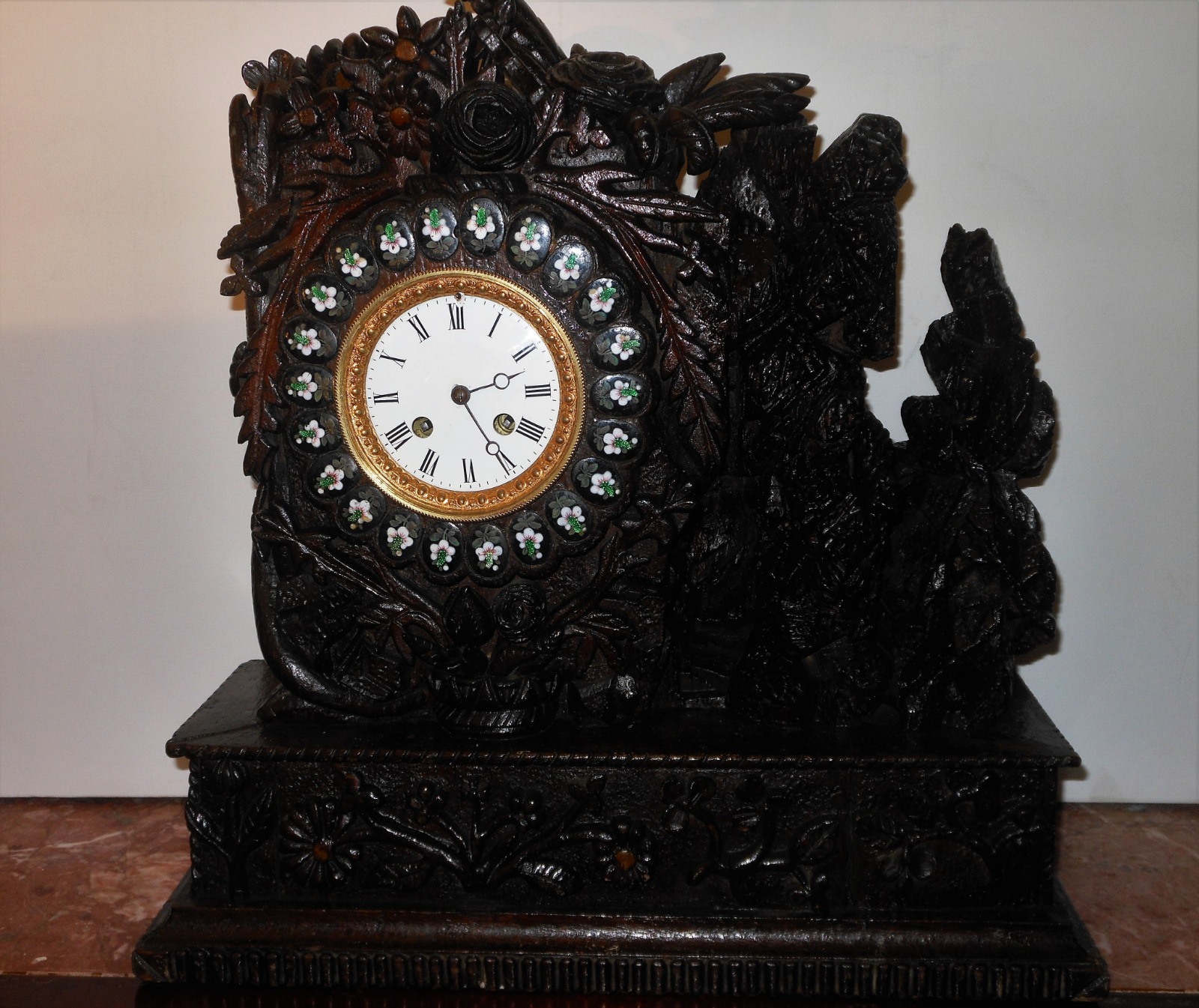 Swiss Black Forest Hand Carved Walnut Mantel Clock