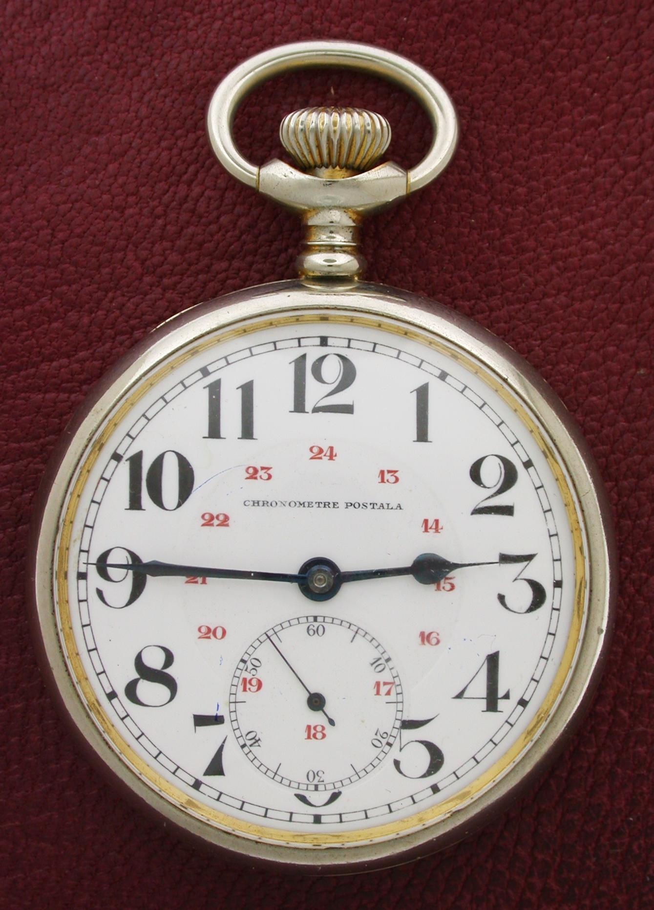 DIAL: The white enamel dial has black Arabic numerals with outer minute divisions, inner Red 24 hour, a subsidiary second’s dial at the six and blued hands. The dial is signed in the upper centre: “Chronometre Postala”.