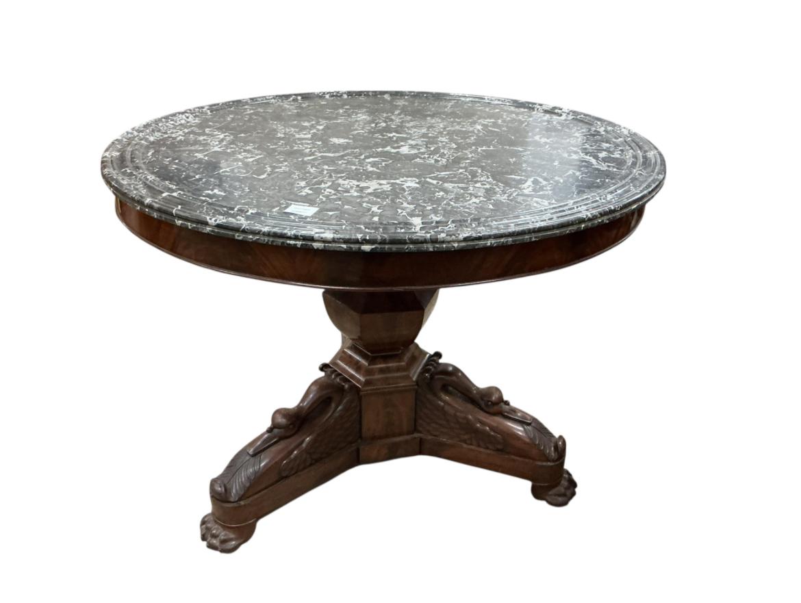 Antique French empire centre table circa 1820 to 1825 made of mahogany and marble. It has an attractive carved swan base.