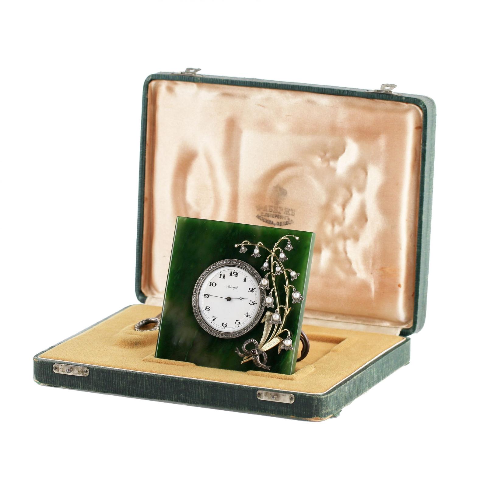 Table clock made of gold, silver and jade. Model by K. Faberge. Russia. 20th century.