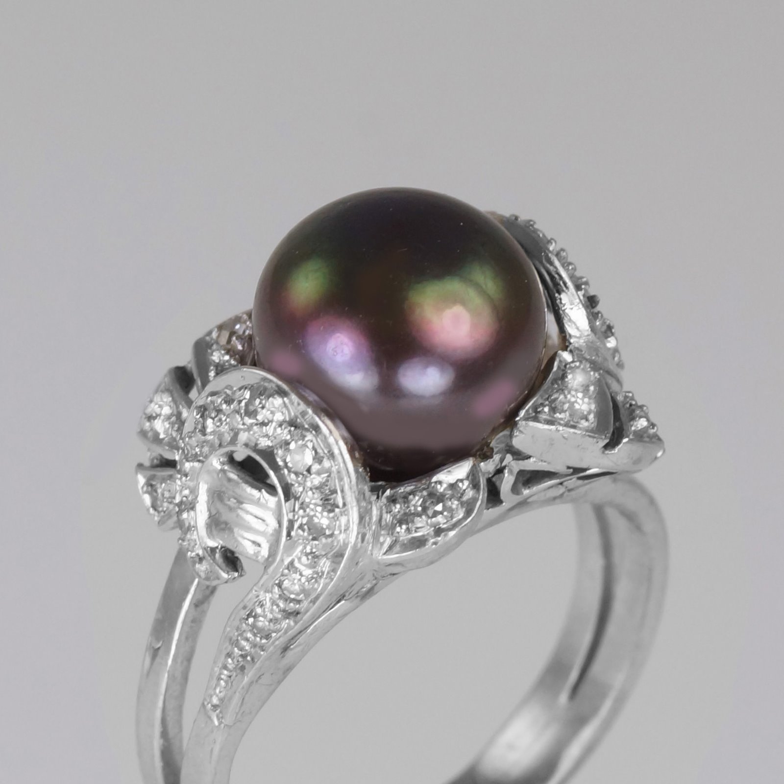 Tahitian Pearl & Diamond Ring 18ct Gold 1960s Black Pearl Cocktail Ring (1 of 14)